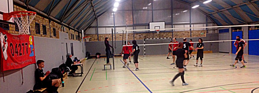 zapp… montag abend… nach erfolgreichem besuch, den wochenstart extrem versüßender plenas, beim rsl und eiskeller, kanns zur formvollendung eines knorke tag’s nur eine reise mit dem fahrrad gen dölitz geben. zur lokalität in der gersterstraße: eine ausgesprochen gedrungen daher kommende turnhalle. ne hütte, marke „made by v.e.b.“, mit dezent diffusem licht, ddr staubsauger geruch in der luft und eigentlich fehlen nur die 5 pfennig gummi brötchen um sich formvollendet „back in the g.d.r.“ zu fühlen. die ersten laute welche durch die alte knarzende hallentür zu vernehmen sind, lauten: „WURSTBIER“. oha! 6 drahtige herren im bestem alter, deren adonis gleiche leiber von schwarz-roter trikotage umhüllt mit klarem blick gen netz starren. imposant! aber rote sterne sind das nicht. auf der anderen seite des netzes rottet sich ein kichernder haufen zusammen. 4 adrette mitglieder der männlicher kaste und zwei nicht minder attraktive teilnehmer*innen der weiblichen gattung, in einem mix team. der volleyball verband erlaubt im „herren“ bereich, bis zu zwei damen pro team…leider nicht mehr, auch wenns dem gegner (bier-)wurst ist. schade eigentlich, lieber verband. warum? beim rsl volleyball team würden gerne mehr damen mitspielen! außerdem wärs ein zeichen gegen sinnlose aufteilung nach sogenanten „geschlechtern“. zum spiel selbst möcht ich gar nich so viele worte verlieren, da ich dem sportlichen teil einer solchen veranstaltung, bekanntermaßen, nicht viel abgewinnen kann. nur so viel: die flugeinlagen waren imposant, die angaben von „sexiest man alive“ J. sind in jeglicher hinsicht umwerfend und wenn die sterne einmal punkteten, spielten sie sich in einen waren rausch, der an SLAYER’s „black magic“ intro erinnern ließ und der auch, gleich den bay area trashern, die zuschauermassen mit sich zog…nur die raumdeckung von neusternistin und hobby dialektiker*in S. provozierte manch stirnrunzeln und ließ den ein oder anderen erbosten zwischenruf unvermeidbar werden…