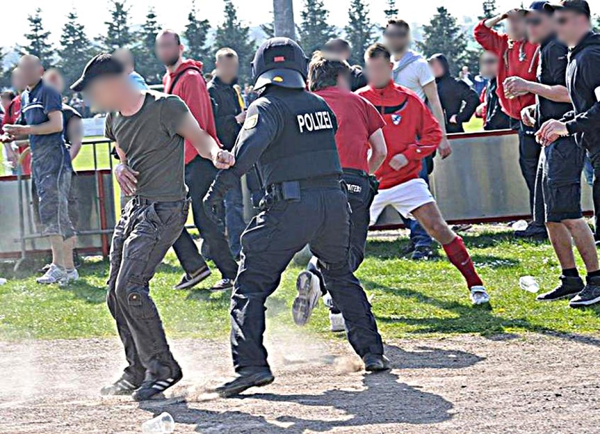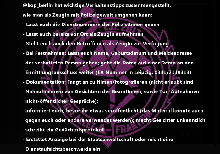Polizeigewalt ist auch für uns als Fußballfans kein Fremdwort, wenngleich wir davon natürlich bei weitem weniger stark betroffen sind als die zahlreichen Todesopfer und deren Angehörige. Nichtsdestotrotz werden auch wir regelmäßig ZeugInnen und Opfer ungerechtfertigter und unverhältnismäßiger Polizeigewalt. Es können Schikanen wie anlasslose Polizeikessel samt „stichprobenartiger“ Personalienkontrollen und dummen Sprüchen sein, sodass man die ersten Minuten des Fußballspiels verpasst (wie jüngst in Meuselwitz als wir unsere FreundInnen von TeBe besuchten), es können aber auch Knüppelschläge sein wie 2010 beim SV Mügeln, als ein Heimfan einen Hitlergruß zeigte und die Polizei daraufhin kurzerhand unseren Block stürmte und um sich schlug. Letztlich wurde dieses Spiel übrigens wegen homophoben und antisemitischen Gesängen (u.a. des „U-Bahn Lieds“) von Seiten der Heimfans durch den Schiedsrichter abgebrochen. [***** *******]