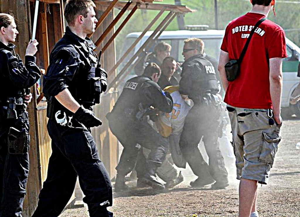 ein kleiner beitrag zum ‚internationalen tag gegen polizeigewalt‘. als rsl fan, habe ich einige sachen sehen, erleben und auch fühlen müssen. eine der ekligsten situation spielte sich am 24.04.2010 beim sv mügeln ab. selten waren zu einem rsl auswärtsspiel derart viele faschos anwesend, welche auch gar keinen großen hehl aus ihrer gesinnung machten. zu beginn der zwoten halbzeit stürmte die bullerei den rsl fanblock und knüppelte nur so um sich. das spiel wurde daraufhin für 20 minuten unterbrochen, auch da sich die gewalt bis aufs spielfeld zog. diverse aktive des rsl worden festgenommen und hatten im anschluss strafverfahren, mit zum teil empfindlichen strafzahlungen an der backe. die polizei selbst begründete ihr damaliges vorgehen im nachgang sinngemäß: ihr hätte eine anzeige eines rsl fans gegen einen menschen aus dem mügeln block, wegen zeigen des hitlergrußes vorgelegen. sie wollte nur die daten vom anzeigenden aufnehmen. wer vor ort war kann den wahrheitsgehalt dieser aussage einschätzen. meiner meinung nach bewegt er sich im minusbereich. einziger lichtblick an diesem hässlichen tag: der schiedsrichter brach das spiel zehn minuten vor ende wegen wiederholtem singen des „u-bahn lieds“ ab („wir bauen eine u-bahn von connewitz nach auschwitz „). die fotos sind von dem tag und zeigen nur einen kleinen ausschnitt vom gewaltausbruch der „staatsgewalt“. [alvy singer]