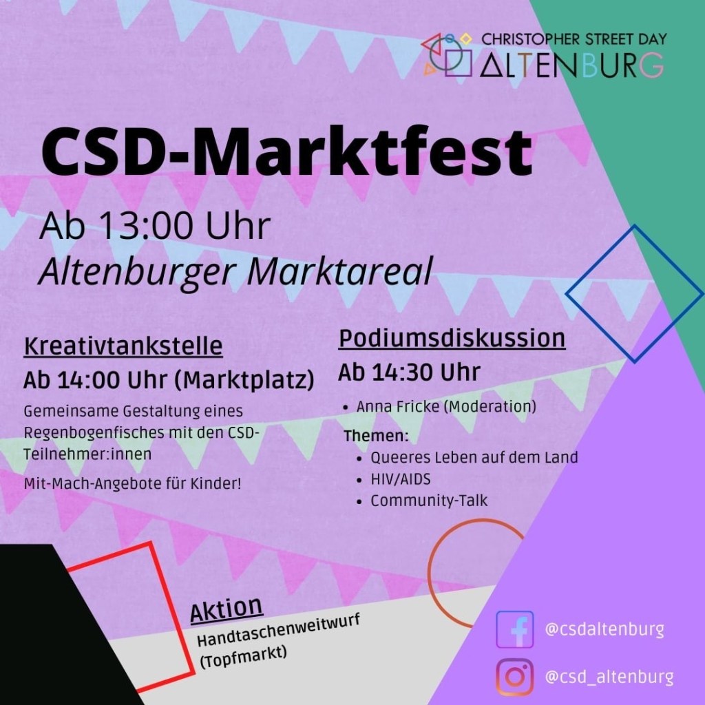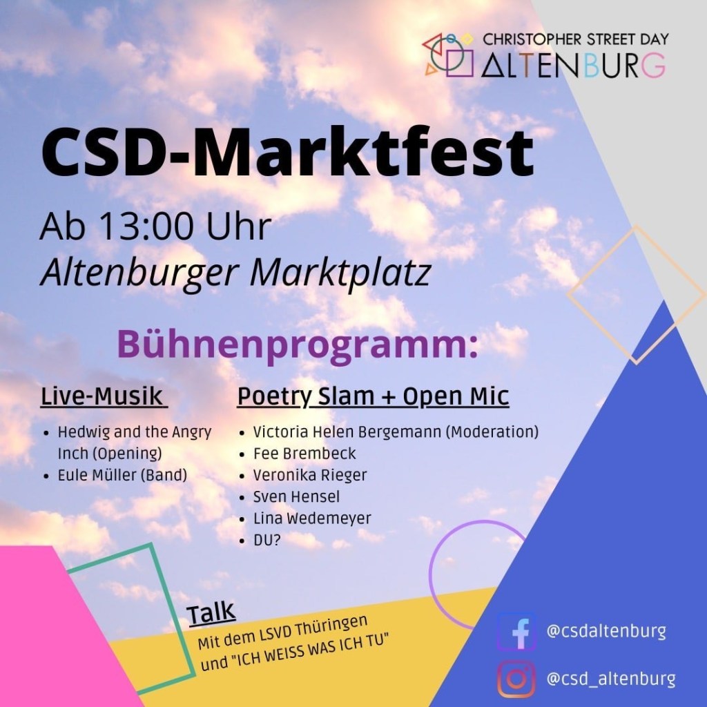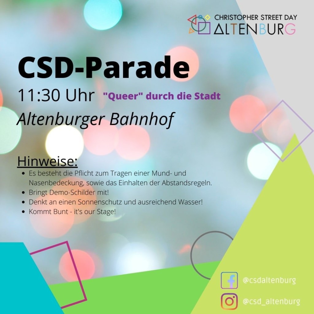 Was ist ein CSD, vielleicht!, für Veranstaltende und Teilnehmende? Ein Gran von: Auch dieser Festivität – u.a. als Selbstvergessen, als Sorglosigkeitsinduktion, weil Traurigkeit und Wut kein Lebensgefühl bilden können, das lang hinhält. Und auch weil´s Spaß macht und mensch Spaß sich nicht versagen lässt von der Humorlosigkeit.