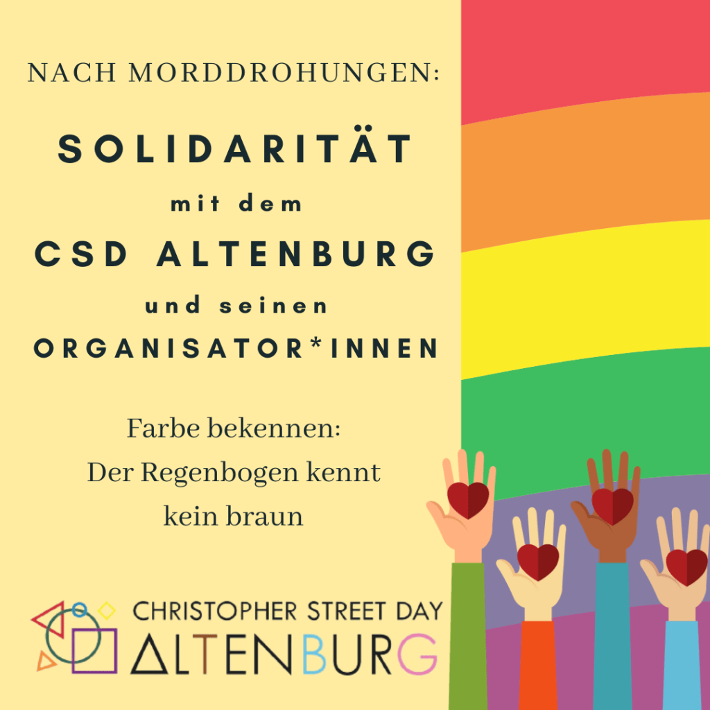 Lassen wir uns also von Bedenkenträger*innen nicht beirren. Wir fahren nach Altenburg, um marginalisierten und ständig diskriminierten Menschen dabei beizustehen, nicht dem Ansinnen gemäß angegriffen zu werden. Wir werden hinfahren, um sie und also uns zu verteidigen. Denn wer nicht das Ich im Du sieht, ist so blind wie der Fleck, den die Nichtbetroffenen für jene schufen in den Institutionen ihrer Verachtung.