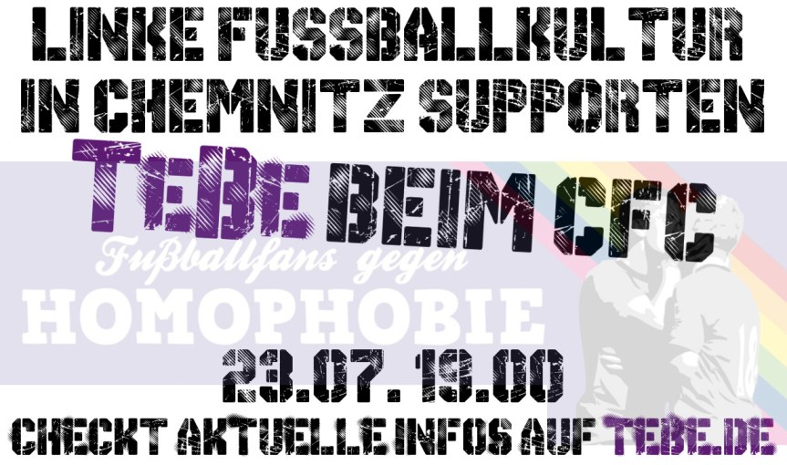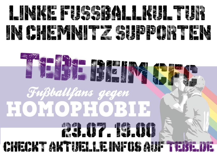 Diesen Freitag zocken die Lilaweißen aus der Berliner Eichkamp beim Chemnitzer FC. Anstoß ist 19:00. Wie kaum ein anderer Verein, wurde gegen Homophobie und Sexismus Pionierarbeit geleistet. Während andere bei dem Thema noch die Scheuklappen aufhatten, ließen die „Schnösel“ mit der Kampagne „Fußballfans gegen Homophobie“ ein Transpi durch die Stadien aller Ligen wandern und sensibilisierten für eine ganz wichtige Sache. Auf dem Stück Stoff zu finden ist ein Bild mit zwei sich küssenden Fußballern (später wurde es um zwei sich küssende Frauen ergänzt). So wenig und doch so viel! Denn „gleichgeschlechtliche“ Liebe war und ist in unserer Gesellschaft immer noch weit davon entfernt anerkannt zu sein. Allerdings auch und gerade durch diese Aktion wieder ein Schritt weiter. Unabhängig von den positiven Signalen, welche der Verein, dank seiner mutigen und kreativen Fanszene sendete, hatte TeBe zwischenzeitlich mehr mit einem Macht und Kontrollhungrigen Individuum Namens Jens Redlich (u.a. Vorstandsvorsitzender) zu kämpfen. Welcher TeBe phasenweise dominierte und auch schon mal das aufhängen der Anti Homophobie Fahne am Fahnenmast im Mommsenstadion verbieten wollte. Aber auch da beeindruckten sie mit Weitsicht und Cleverness und entmachteten ihn schließlich nach einem langen harten Kampf. Alle hinfahren und linke Fußballkultur in Chemnitz supporten!