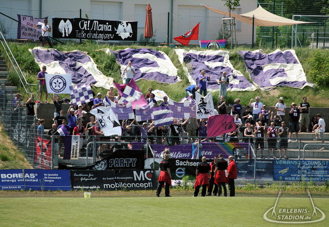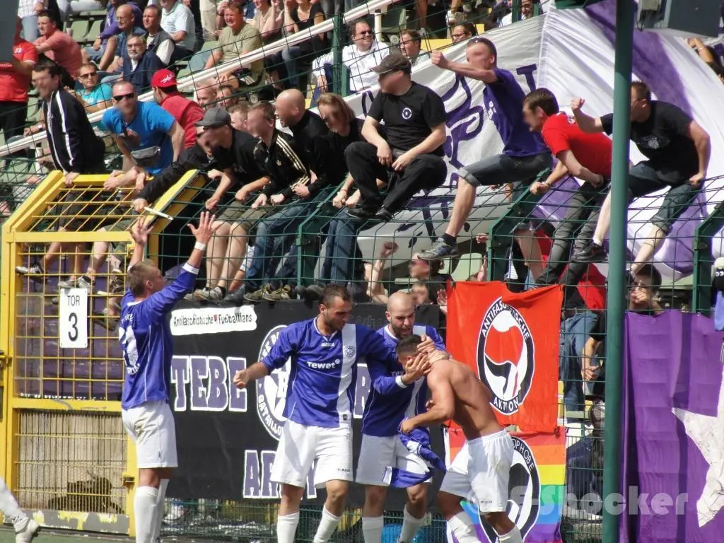 …noch andere kamen direkt aus dresden-nord, um den gegner anzufeuern. mit diesem gegner „borea dresden“ verbinde ich nichts positives. um genau zu sein auffällig viel negatives. vor fast genau 10 jahren schoss borea TeBe in zwei umkämpften relegationsspielen samt verlängerung aus der oberliga in die sechstklassige berlinliga. um sich dann kurz nach saisonstart aufgrund von „finanziellen problemen“ vom oberliga spielbetrieb abzumelden. tja richtig blöd. TeBe half das nicht mehr und so verblieb die lila-weißen ganze vier jahre in der „stadtliga“. letztes jahr wurden wir bei ankunft im steyer stadion von orangenen kunden übel beleidigt. und dann ist da noch die dummdreiste umbenennung des eigentlich als „fv dresden nord“ firmierenden clubs in „sc boreas dresden“ (mensch beachte das „s“ am ende) und versuchtem namenssponsoring des dresdner windenergie unternehmens „boreas“. ist auch eher als panne aktion in erinnerung. so weit so ungut, nun waren wieder viele borea (nun ohne „s“) fans anwesend, wobei sich die große mehrheit darauf beschränkte, nur dann ihr team zu besingen, wenn es tore schoss. „you only sing when you’re winning!“. ausgenommen eine kleine gruppe von etwa 5-7 dudez, welche sich in der kurve zwischen südtribüne und anzeigentafel eingerichtet hatten. die zwei „vorsänger“ gaben alles und das schreib ich jetzt nicht nur so daher. leider selten synchron und meist auch ohne kommunikation mit ihren eigenen leuten. eine trommel würde da viel helfen. dafür hatten sie spruchbänder und fahnen dabei. nunja, besser als nix? zum spielgeschehen kann ich wie immer nicht viel sagen, nur so viel, der gegner hat wohl das ein oder andere tor mehr fabriziert 😉 .