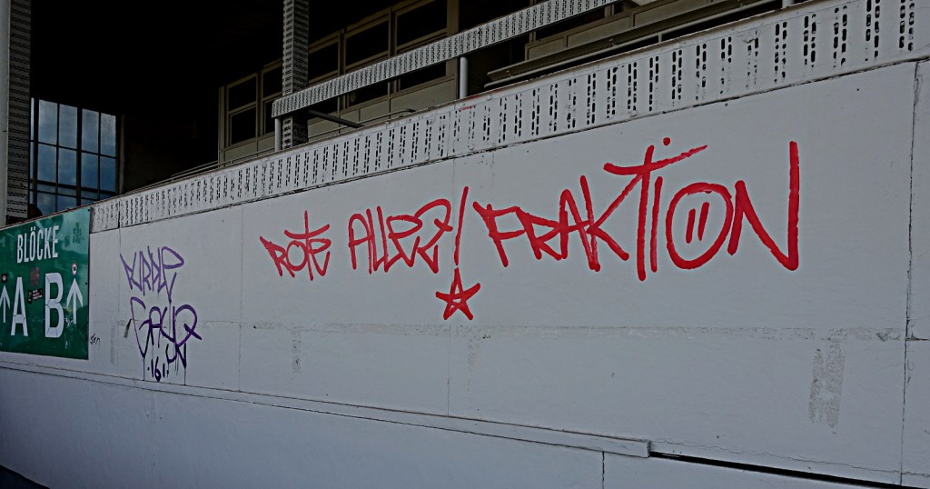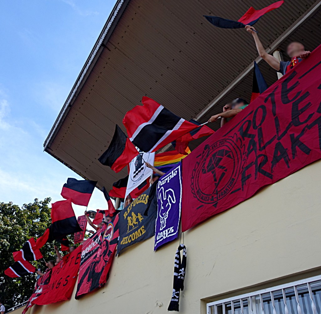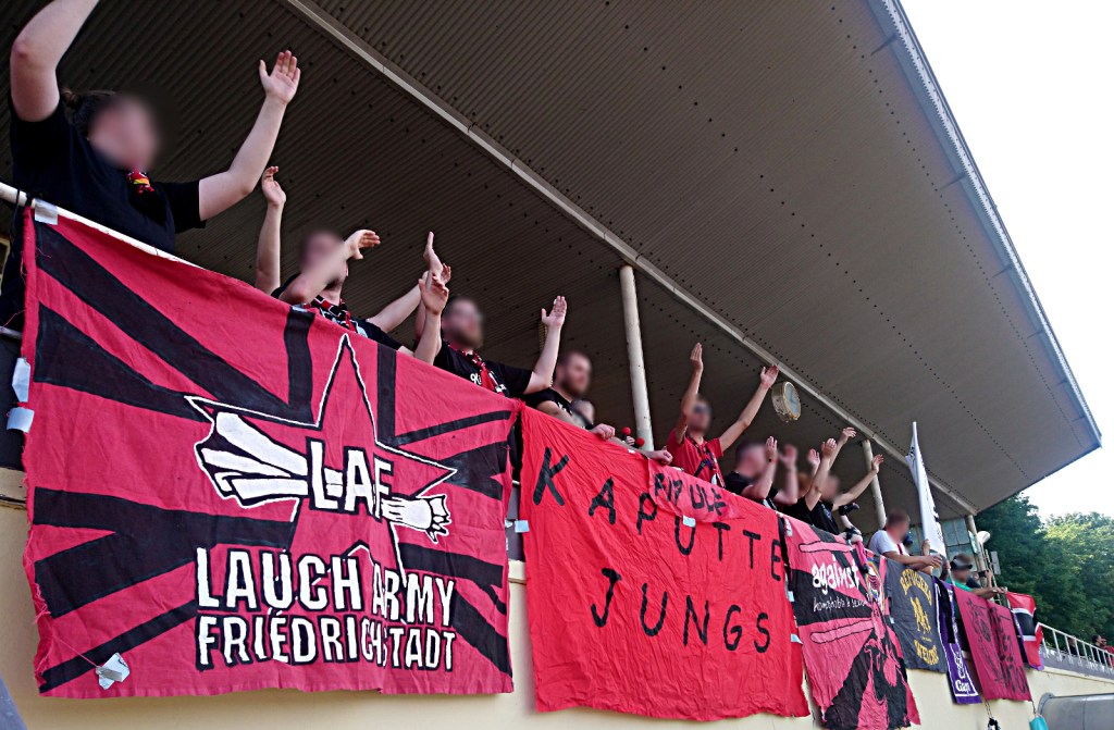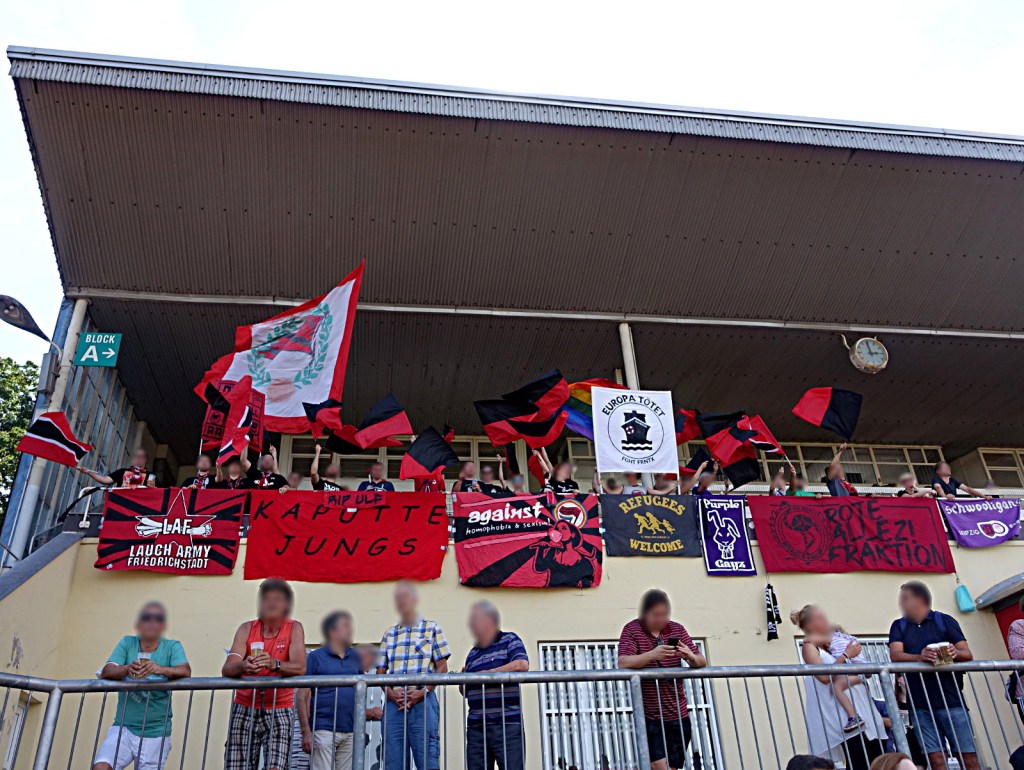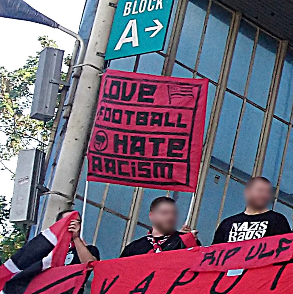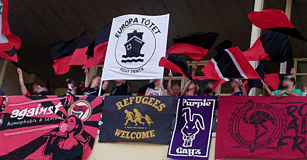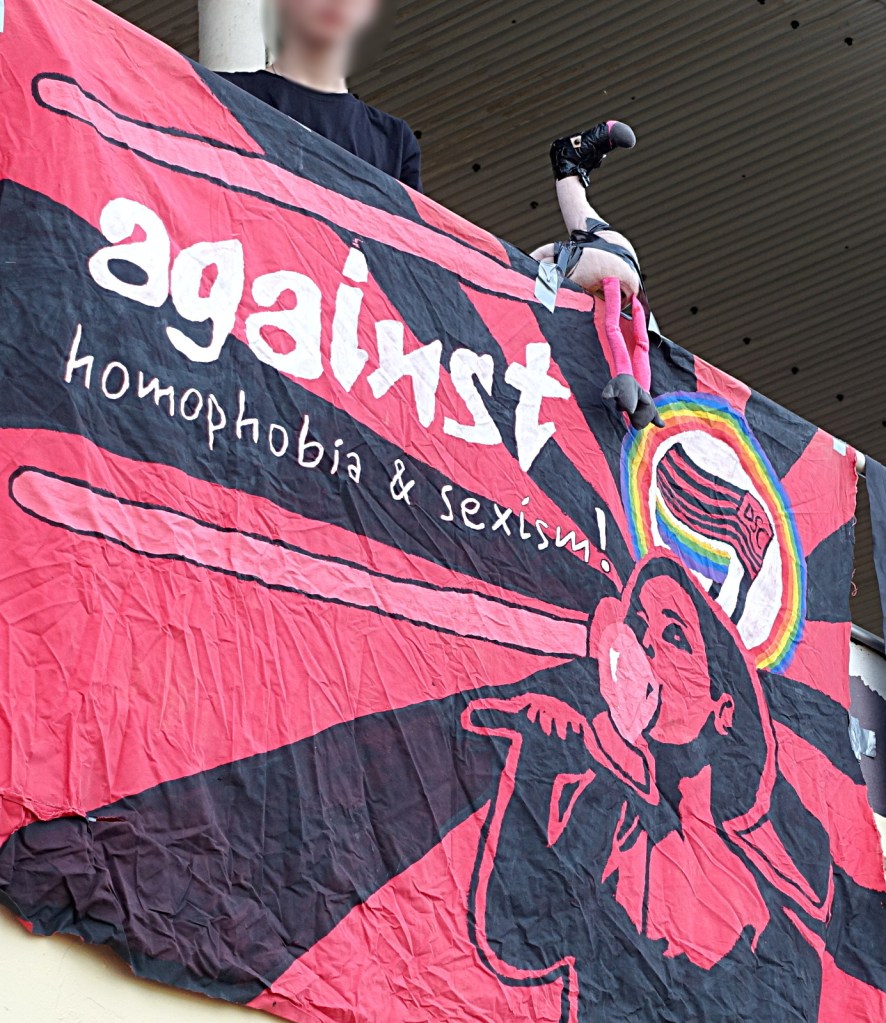 bei der gelegenheit unseres ausflugs zu unseren freund*innen vom dsc präsentierten wir erstmals unsern neuen lieblings-doppelhalter. es, als einziges, veranlasste dann aber doch ein paar alteingesessene, bebauchte grauhaarträger, sich über die einschränkung des sichtfeldes zu beschweren. auf die frage hin, um wie viel meter wir die aufstellung verschieben mögen, um ihren fußballgenuss nicht einzuschränken, kam heraus, dass es nicht so sehr der standort, sondern die botschaft war, welche ein paar wenige menschen störte, die „seit 40 jahren“ zum dsc kommen. die botschaft lautet: „europa tötet, fght frntx.“