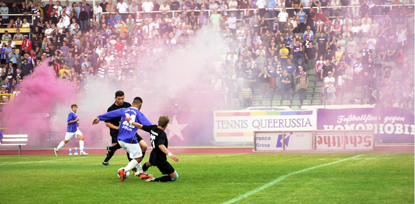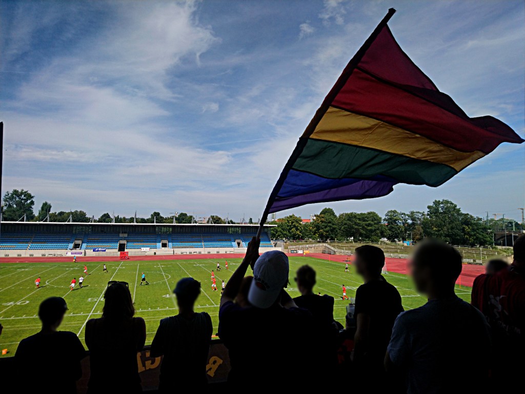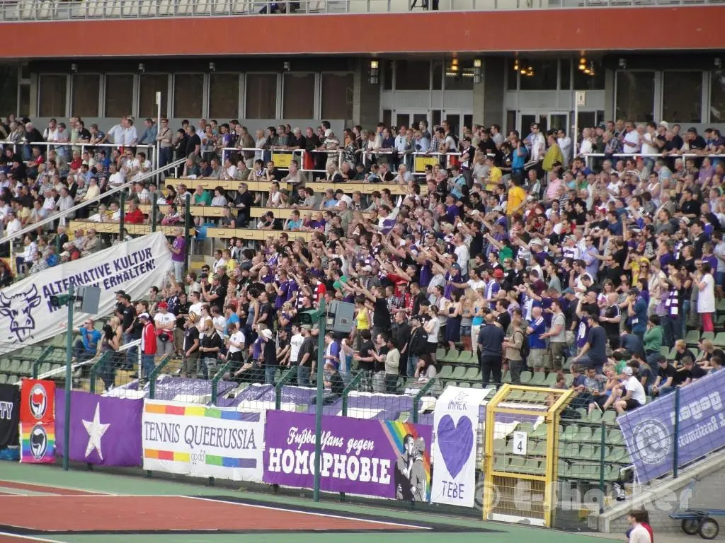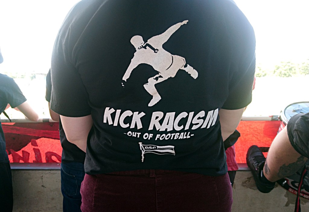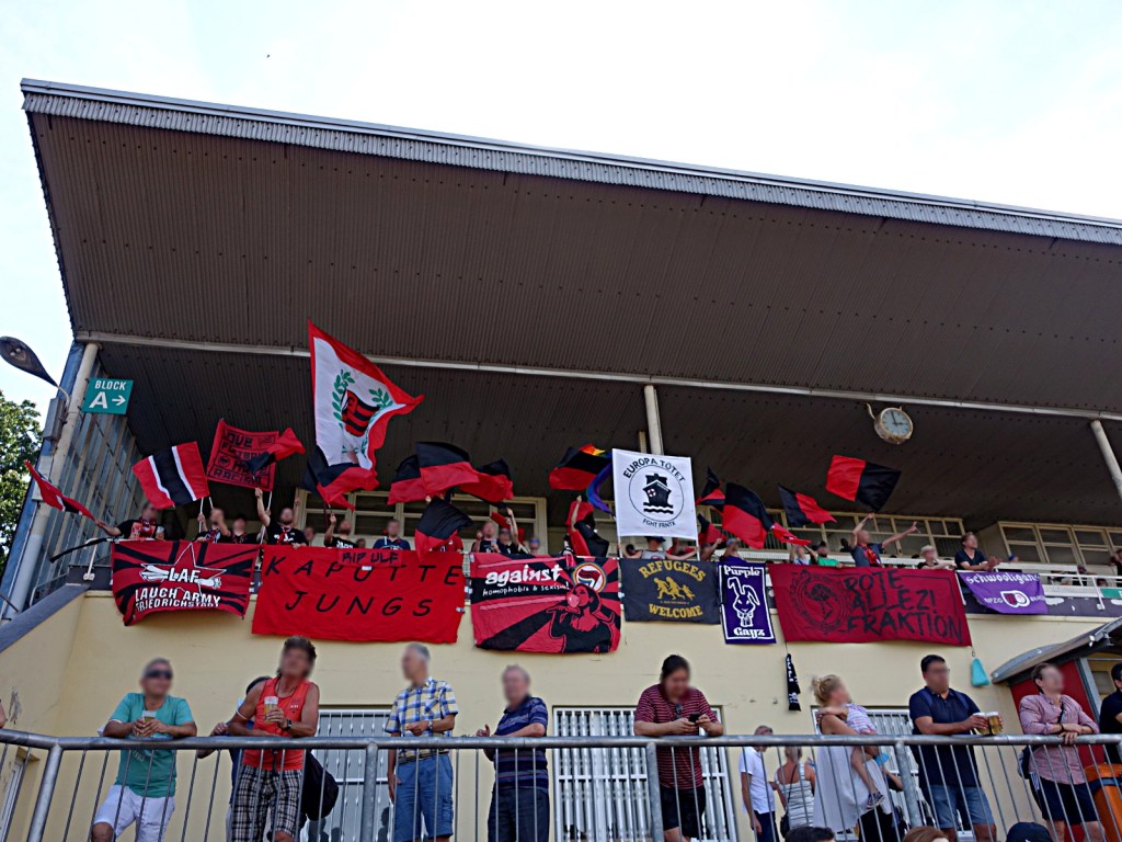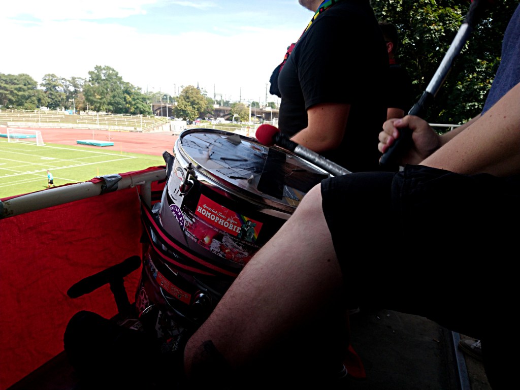 interessant bis bemerkenswert ist die entwicklung des dsc im umgang mit politik im stadion. war vor sieben, acht jahren noch das aufhängen der 04277-fahne schon mal damit verbunden, dass irgendwelche alternden ronnies angehumpelt kamen, um ihren unmut zu äußern oder um am abhängen zu scheitern. gerne gabs auch komische kommentare von fraktion „fußball bleibt fußball…“, oder entrüstete blicke von den „ostragehege opas united“. heute hängt da ganz selbstverständlich eine „refugees welcome“ fahne am oberrang, eine mit „against homophobia & sexism“, ein doppelhalter mit „love football hate racism“, daneben transpi spekulatius wie „lauch army friedrichstadt“ oder diverse zaunstoffe angereister mit gleichermaßen klangvollen wie subtil provokanten namen: „TeBe schläger“, „purple gayz“ oder natürlich „rote allez! fraktion“. negatives feedback während des spiels dazu? null! als jemand, der mittlerweile schon zehn jahre zum dsc flaniert, möge mir erlaubt sein, dies als bemerkenswert zu bezeichnen. allerdings wurde mir nach dem verfassen dieser zeilen zugetragen, dass es doch unmutsäußerungen gab. doch lest selbst den folgenden abschnitt, welcher von jemand anderem verfasst wurde…
