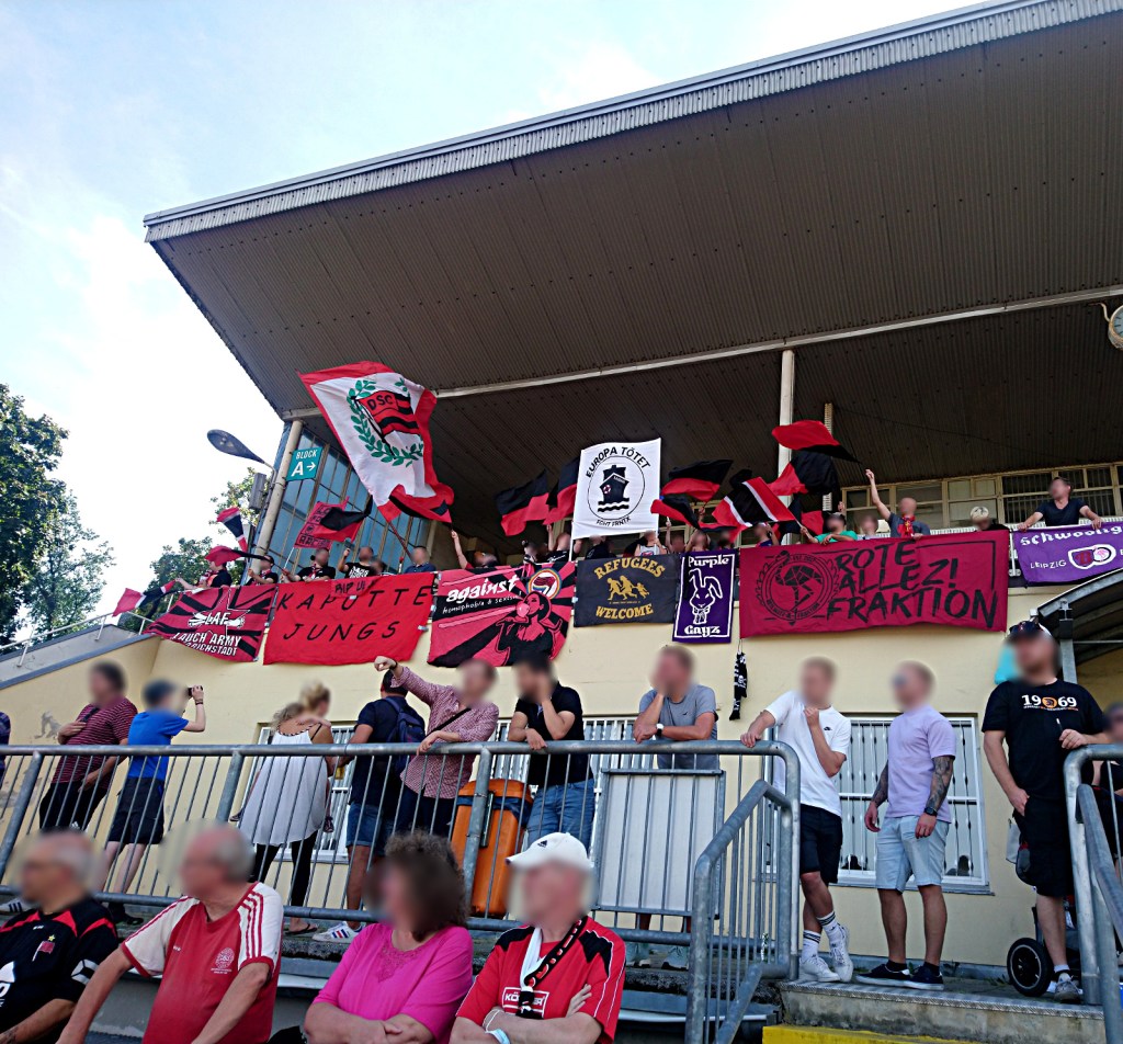 bei herrlichen temperaturen fanden sich vier fahrer*innen nebst karren, um alle menschen von leipzig nach dresden zu chauffieren. manche reisten auch aus berlin an und verbrachten das ganze we in leipzig. u.a. um tags zuvor einer führung durch die leipziger stadionwelt der 1910er bis 1940er beizuwohnen (der bericht dazu folgt die tage). andere kamen aus hannover-linden daher, um mit uns einen stimmungsvollen block zu bilden…