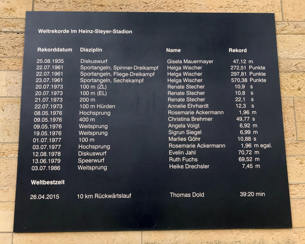 an der außenwand des steyer stadions ist nahe dem marathontor eine tafel mit allen im stadion aufgestellten rekorden angebracht…