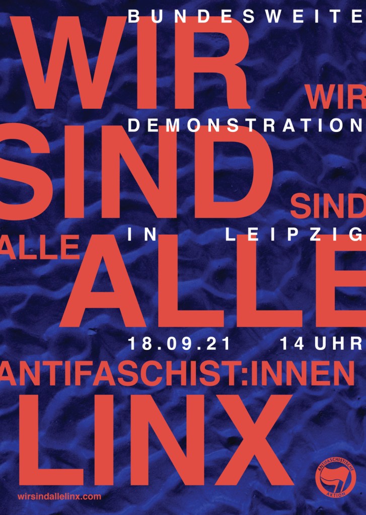 Diesen Mittwoch ist Prozessauftakt. Wir rufen alle Antifaschist:innen dazu auf, am 18.09.2021 zur bundesweiten Demonstration „Wir sind alle Antifaschist:innen – Wir sind alle LinX“ nach Leipzig zu kommen. Start ist 14:00 am Johannisplatz. Checkt die Pages von Wir sind alle Linx!