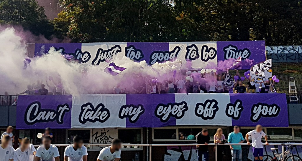 bei diesem hannoveraner sportverein im alternativen kiez linden fand sich vor knapp acht jahren die fanszene 1907 zusammen. ich muss leider zugeben, dass mir dies in den ersten fünf jahren komplett entgangen ist. erst beim „dr. waldemar spier pokal“, einem klasse hallenturnier in düsseldorf, fielen mir einige lila weiß gewandete auf. wobei „einige“, eine völlig unangebrachte formulierung darstellt. eher taugen da worte wie „mob“, „meute“ oder „riesiger haufen“. das eventuell etwas verzerrte bild aus meiner erinnerung: elfmeterschießen zwischen linden und einer anderen truppe. die andere truppe steht mit ihren zehn leuten in der nähe der jeweiligen schützen*, redlich bemüht, diese durch anwesenheit und aufmunternde klatschbewegungen zu supporten. linden steht dagegen alleine rechts und links neben den torpfosten mit gefühlt 50 menschen „stattlicher“ statur. welch imposanter anblick! schütze sein möchte ich jetzt nicht, dacht ich mir damals. wer zur hölle ist das eigentlich? dacht ich mir außerdem. in der nacht, welche mehr oder weniger tanzend verlebt wurde, wurden erste zarte anbändelungen begangen… so verbrachte ich das frühstück am morgen danach auch demonstrativ am lila weißen tisch.