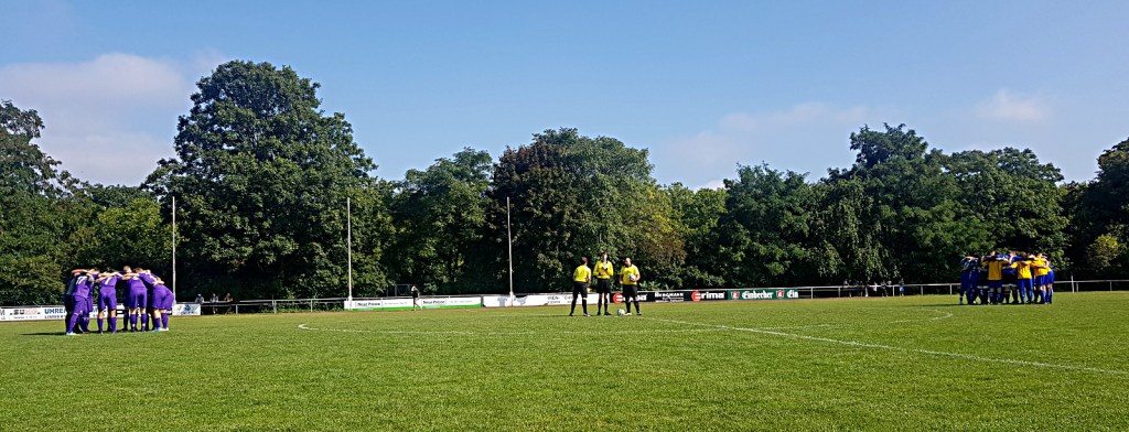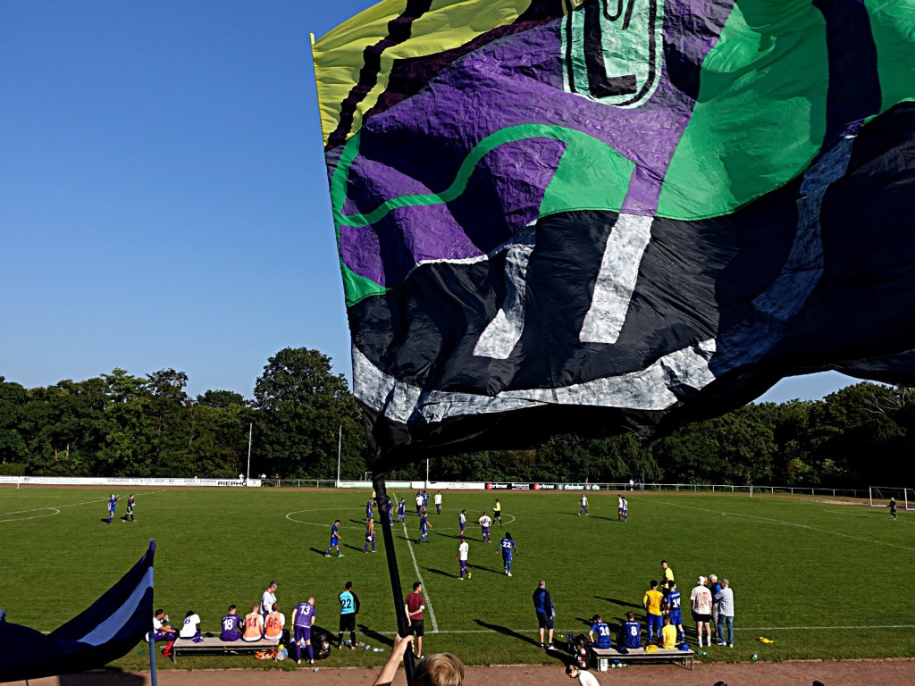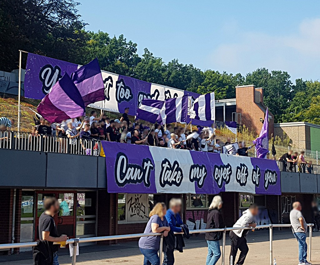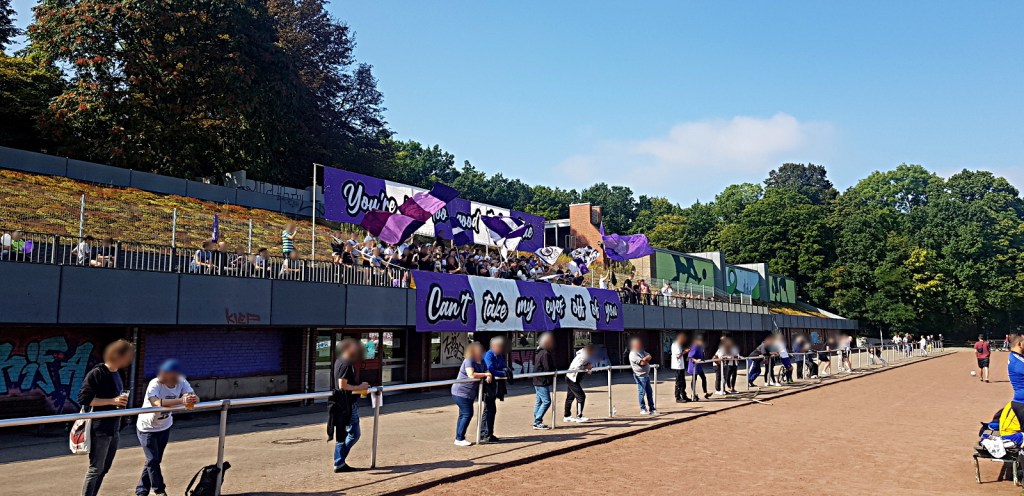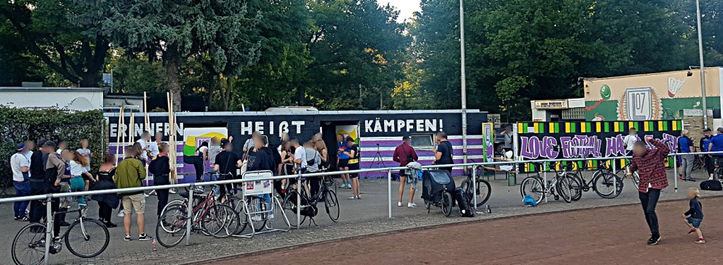 bei ankunft unserers autos wurden wir erst von supportaffinen dann von der nicht minder wortgewandten vereinspräsident*in (?) empfangen und in ein längeres begrüßungsgespräch verwickelt. herzliche begrüßung quasi auf allen (vereins)ebenen. nach gemeinsamen vorbereiten der choreo gab es eine ergreifende begrüßungszeremonie für die verbändelten göttinger*innen. hätte jemand ein inbrünstiges „LOS! JETZT! HIER!“ gerufen, die szene hätte für außenstehende auch anders wirken können 😉 . tapeten, rauch, singsang und knuddeln! what more do you want!? drei stunden vor spielbeginn schon essen im stadion anzubieten und dann noch liebevoll kredenzte vegan belegte brötchen, hat seltenheitswert. fettes kompliment an die fanszene 1907! die spielstätten-gaststätte erschien mir fest in der hand von einer ausgesprochen kompetenten, schlagfertigen und überaus sympathischen „macher*in“. vegi in allen formen. würstchen, bouletten,… nudelsalat, tolle getränkeauswahl und und und…. verbesserungswünsche? nope!