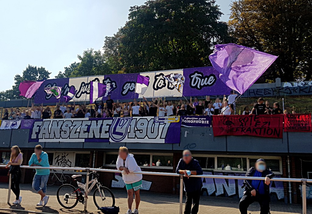 letztes jahr schlugen blickige freund*innen vom dresdner sportclub vor: lasst uns mal gen linden pilgern! drei auto ladungen folgten dem vorschlag und die leipden/dresdzig abenteuerreisegruppe sollte es nicht bereuen. ein großartiger tag mit fanmarsch, strabafahrt durch die uns völlig unbekannte stadt in den neuen „alten ländern“ und besuch eines bemerkenswerten grounds. die dortige tribüne hatte es mir aus vielerlei gründen mehr als angetan. anzahl stufen, neigungswinkel, dachkonstruktion, einfach perfekt für einen haufen lindener größe. einen bericht zu diesem großartigen ausflug verfasste ich damals, welcher aber aus gründen bisher in den untiefen der recheneinheit wartet, auf veröffentlichung hoffend (neues ziel: 14.09.!). nach dem ersten besuch war eines völlig klar: da müssen wir unbedingt nochmal hin! am besten zu einem heimspiel. ein virusdominiertes jahr verging, bis es so weit sein sollte…
