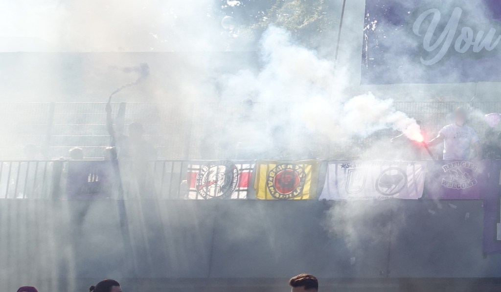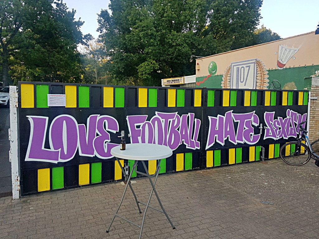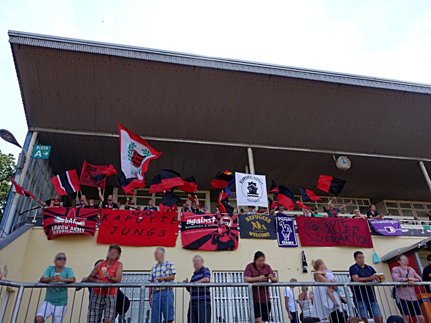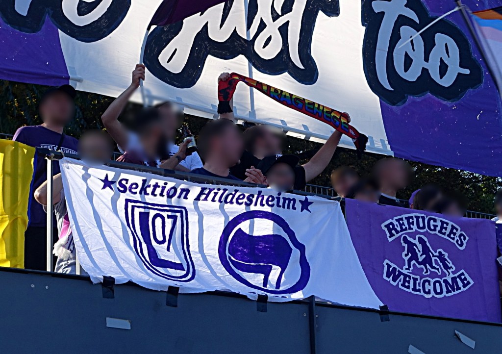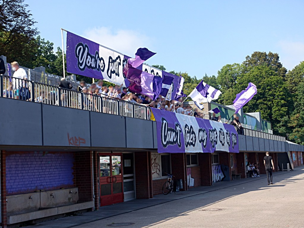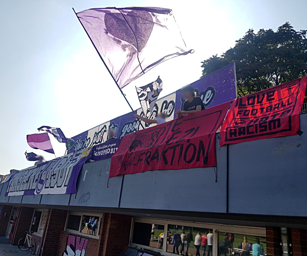 vor ort gab es einiges zu beäugen, neue graffiti, welche von der klaren haltung der fanszene und des vereins zeugen, prima sticker, starke doppelhalter und zaunfahnen mit deutlichen ansagen! manche von den gastgeber*innen, andere von den angereisten.