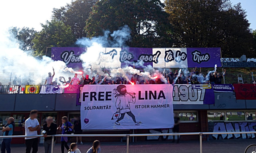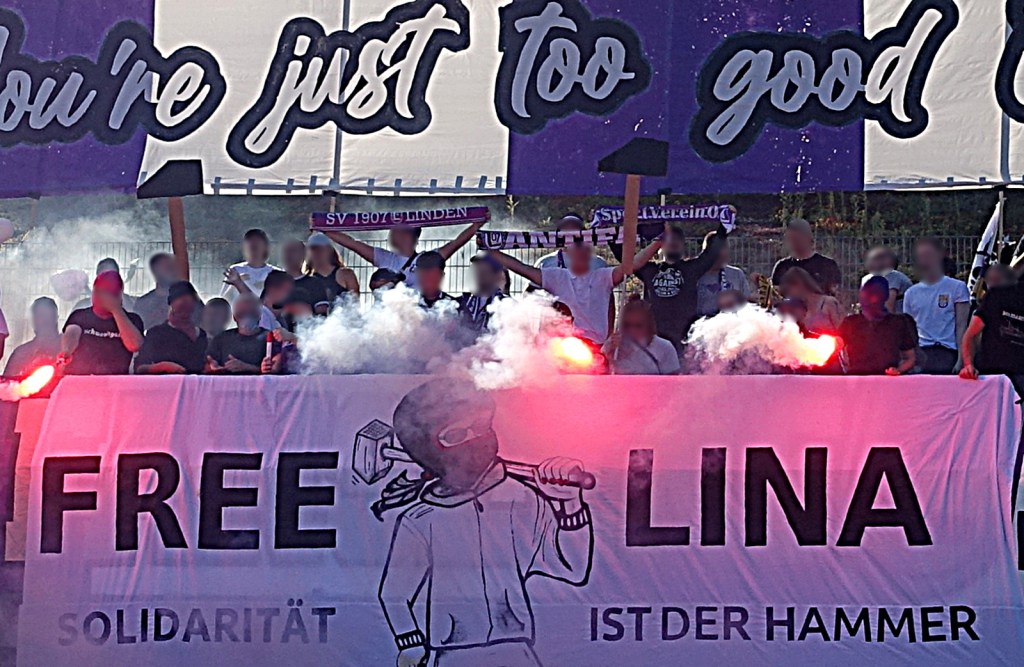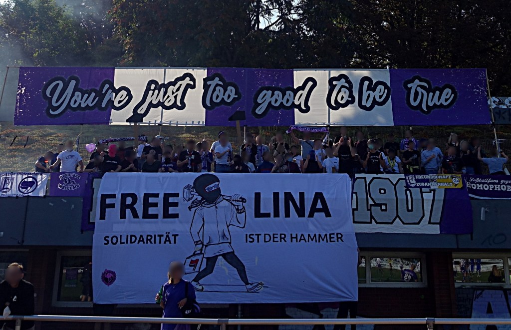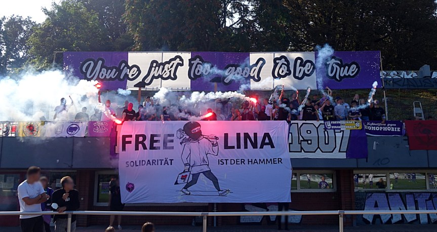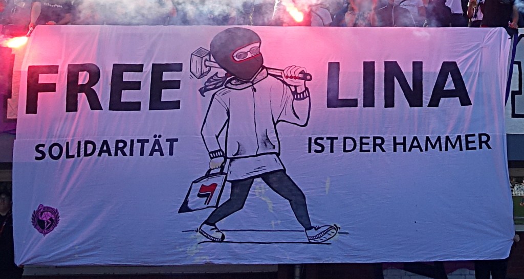 die letzten 12 monate hatten es für einige von uns in sich, trennten wir uns immerhin von unserm angestammten verein, bei dem uns ein weiteres engagement nicht mehr länger tragbar erschien. tragbar und wichtig dagegen politisches engagement und der blick für die zeichen der zeit bzw. die fokussierung auf wirklich unterstützenswerte projekte. dazu zählen politisch verfolgte und inhaftierte ganz besonders. die meisten haben mitbekommen, was lina passiert ist, was ihr vorgeworfen wird und dass ihr ab dem 08.09. der prozess gemacht werden soll. damit ist sie kein einzelfall, aber die art, wie staatsanwaltschaft und bestimmte medien sie an den pranger stellen und versuchen sie mit rechten mördern gleichzustellen, macht es aktuell zu DEM FALL! wir finden, dass es für das thema gar nicht genug positive mediale aufmerksamkeit geben kann. deshalb haben wir eine kleine support kampagne ausgeheckt. erfreulicherweise hatte die fanszene 1907 sofort bock darauf, dies gemeinsam in ihren ground zu tragen. wir nähten und malten zwei tage den stoff, linden schraubte zwei angemessen über-proportionierte hämmer zusammen, dazu ein wenig leckereien aus dem büroschrank und fertig.