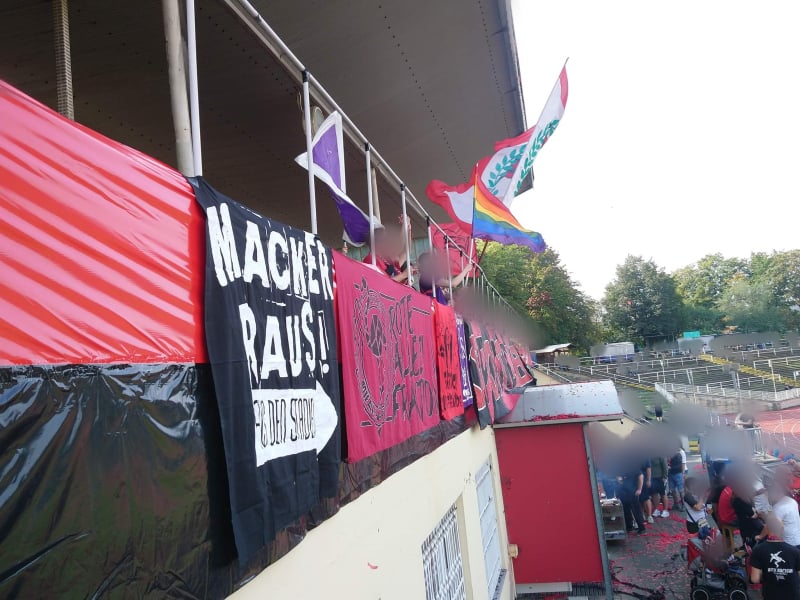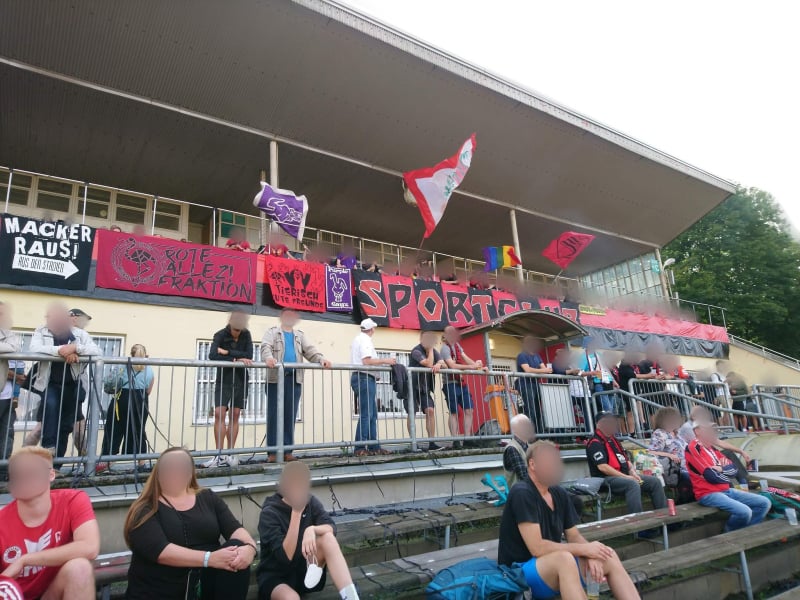 Ein bisschen wie nachhause kommen ist das Erklimmen der steilen Stadiontreppen in der Landeshauptstadt jedes Mal. Mensch liegt sich in den Armen und freut sich darüber, endlich wieder gemeinsamen Unfug anzustellen. Die Friedrichstädter Jungs – und Mädels! – hatten sich dieses Mal sogar eine besonders süße Überraschung einfallen lassen und so begrüßten uns nicht nur unsere Freund*innen, sondern auch ein Freundschaftsbanner, welches die tierisch gute Freundschaft zwischen Flamingo (uns), Maulwurf (DSC) und Hase (Purple Gayz) zelebriert. Seit noch nicht mal einem halben Jahr besteht diese Dreierkonstellation erst und trotzdem scheint es für keine*n von uns Zweifel daran zu geben, dass sich hier ein paar Menschen gefunden haben, die zusammenpassen wie Arsch auf Eimer. Da lassen wir weder ein paar entrüstete Spießer*innen zwischen uns kommen, die den Linksextremismus in Form der Roten Armee (wtf?! ALLEZ!!) Fraktion ins HSS Einzug halten sehen, noch die Stadt Dresden, die unsere gegenseitigen künstlerischen Liebesbotschaften allesamt hatte überstreichen lassen, obwohl die Tribüne ohnehin bald dem Erdboden gleichgemacht wird (Malverderber!).
