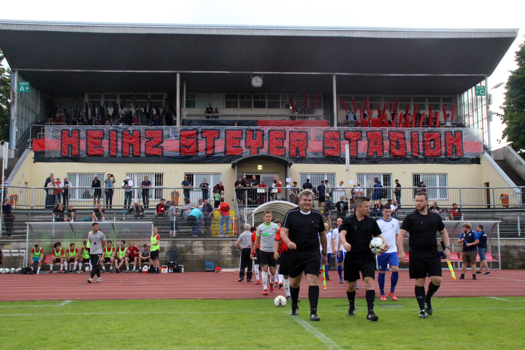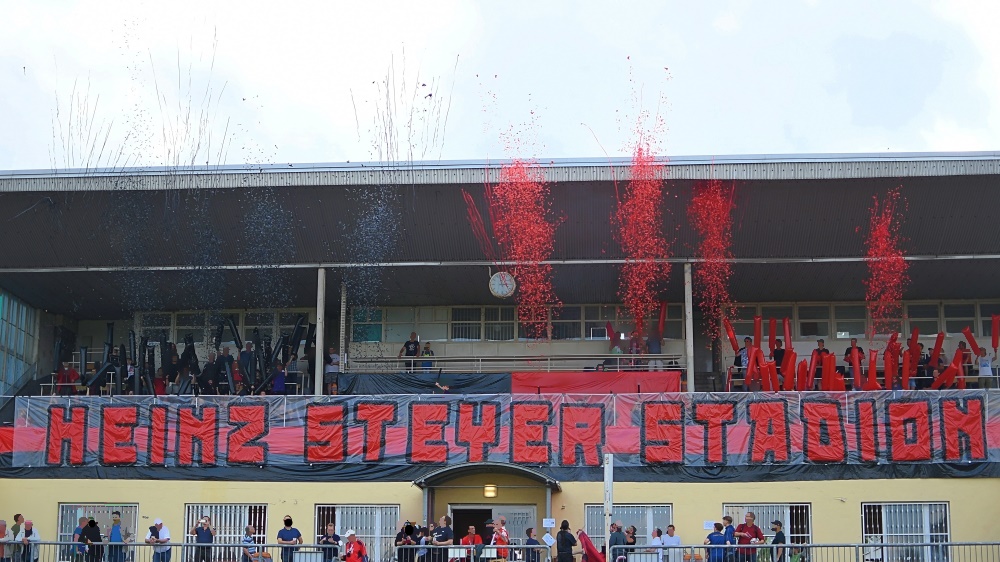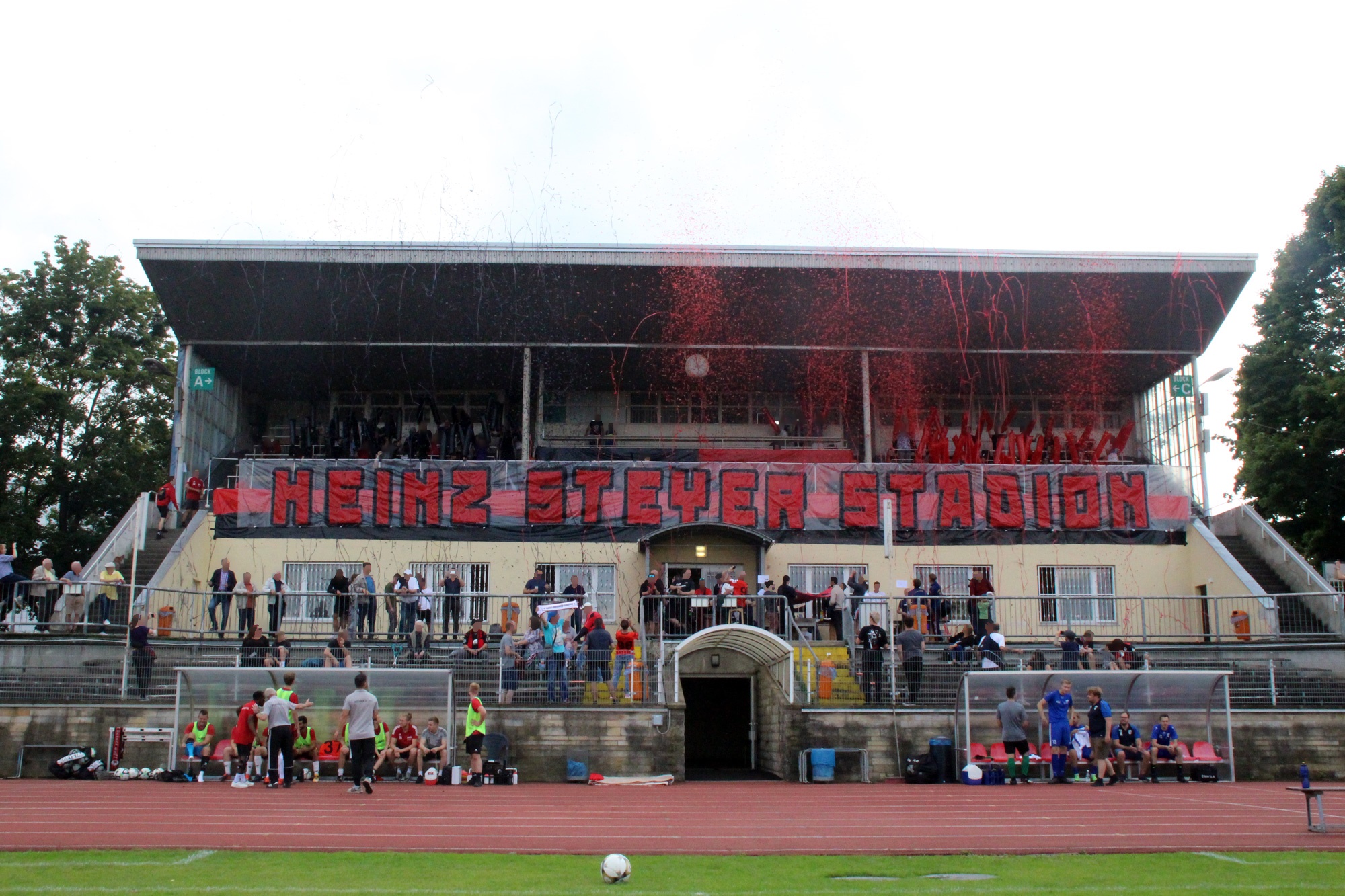 Wir fanden uns also zum offiziellen Abschied des altehrwürdigen Heinz-Steyer-Stadions ein, um uns gebührend davon (und von unserer Tribüne) zu verabschieden. Eine große Choreo ward angepriesen und so halfen wir tatkräftig bei ihrer Vorbereitung mit. Nun gut, wir versuchten es zumindest, aber wer hätte auch ahnen können, dass es eine Wissenschaft für sich ist, Klatschstangen mit Luft zu befüllen und dann auch noch einen Knoten zu machen?! Die Hilfe beim Stangenkonstrukt war dagegen einfacher – zumindest für alle, die größer als 1.60m sind. Für die anderen wurde das zur ausgiebigen Dehnübung. Letztlich waren alle Klatschstangen aufgepustet, die Banner befestigt und die Warnzettel für unsere Lieblingsrentner*innen festgeklebt. Die Choreo lief reibungslos ab (wie hätte es bei dieser Vorbereitung auch anders sein sollen?) und die Konfettikanonen ballerten schwarz und rot in die Luft. Ein herrlicher Anblick.