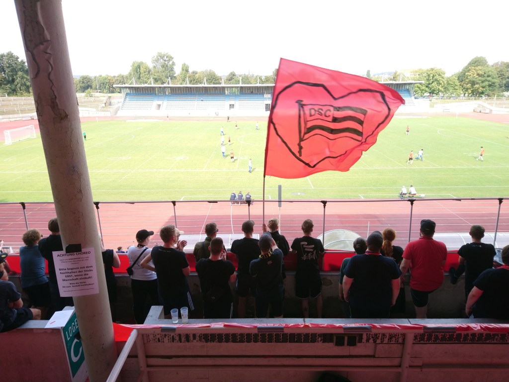 Einiges zu jubeln gab es auch spielerisch, denn der DSC schoss den SV Sachsenwerk Dresden letztlich mit einem 3:0 ab, sodass es nicht schwer war, die 90 Minuten mit schallerndem Support und einer angemessenen Abschiedsfeier zu verbringen. Das Spektakel erlebten 555 Menschen aus allen Ecken Deutschlands mit, darunter vermutlich einige Groundhopper*innen, die sich diese (fast) letzte Chance auf den Ground nicht entgehen lassen wollten. Zu ihren Ehren ertönte nach Abpfiff sogar noch ein eigener Gesang mit Augenzwinkern („Ohne Hopper hätten wir mehr Bier!“).