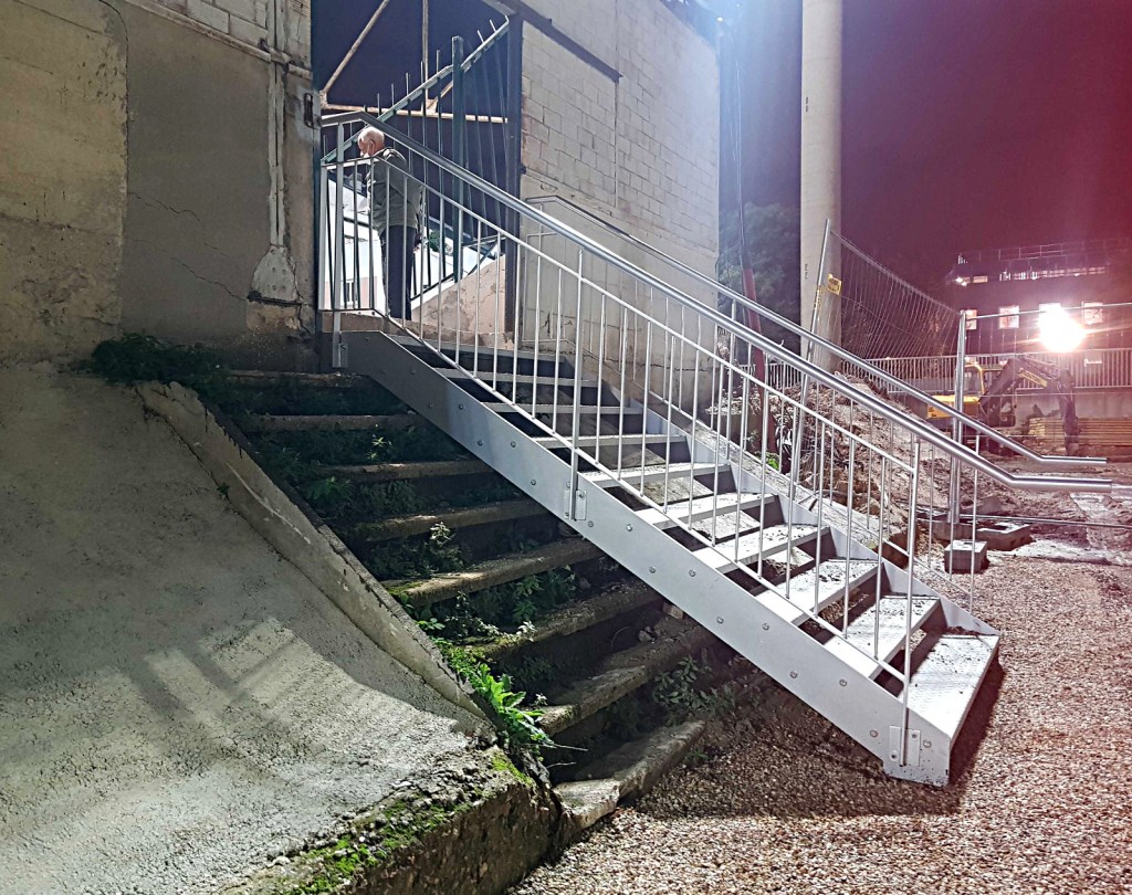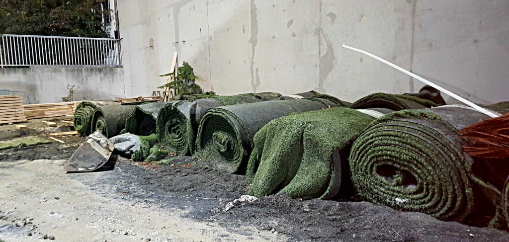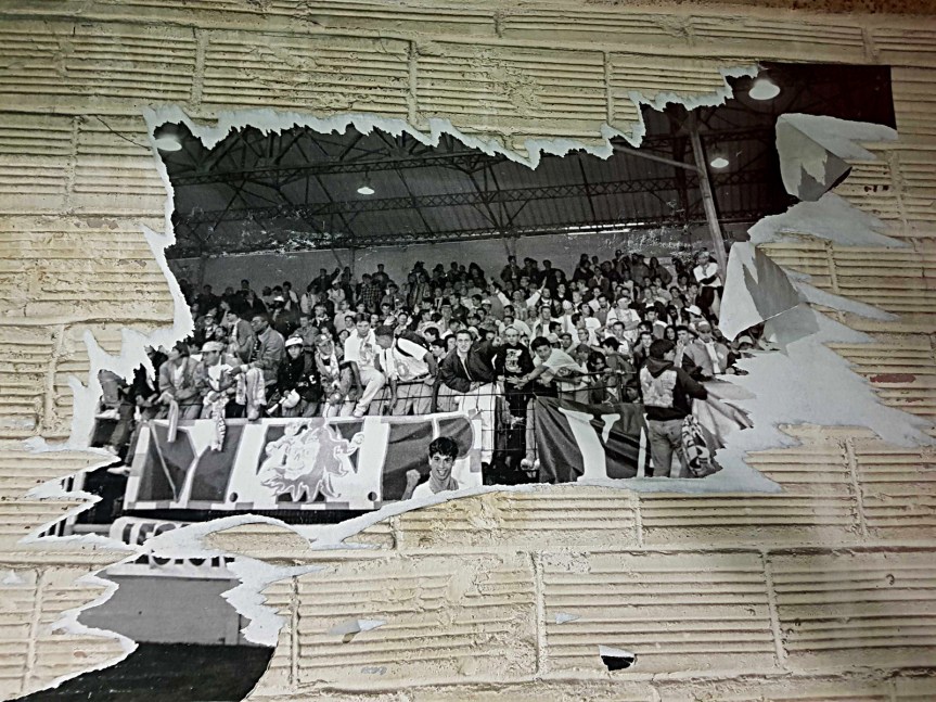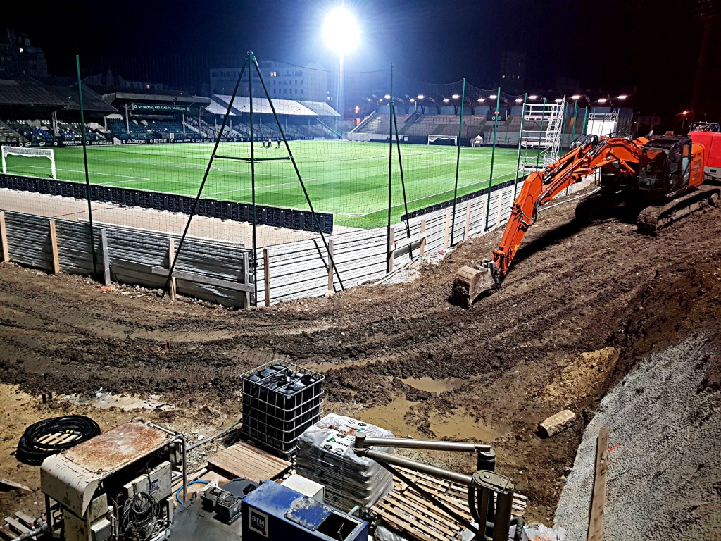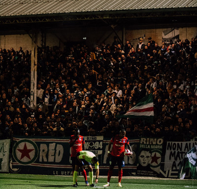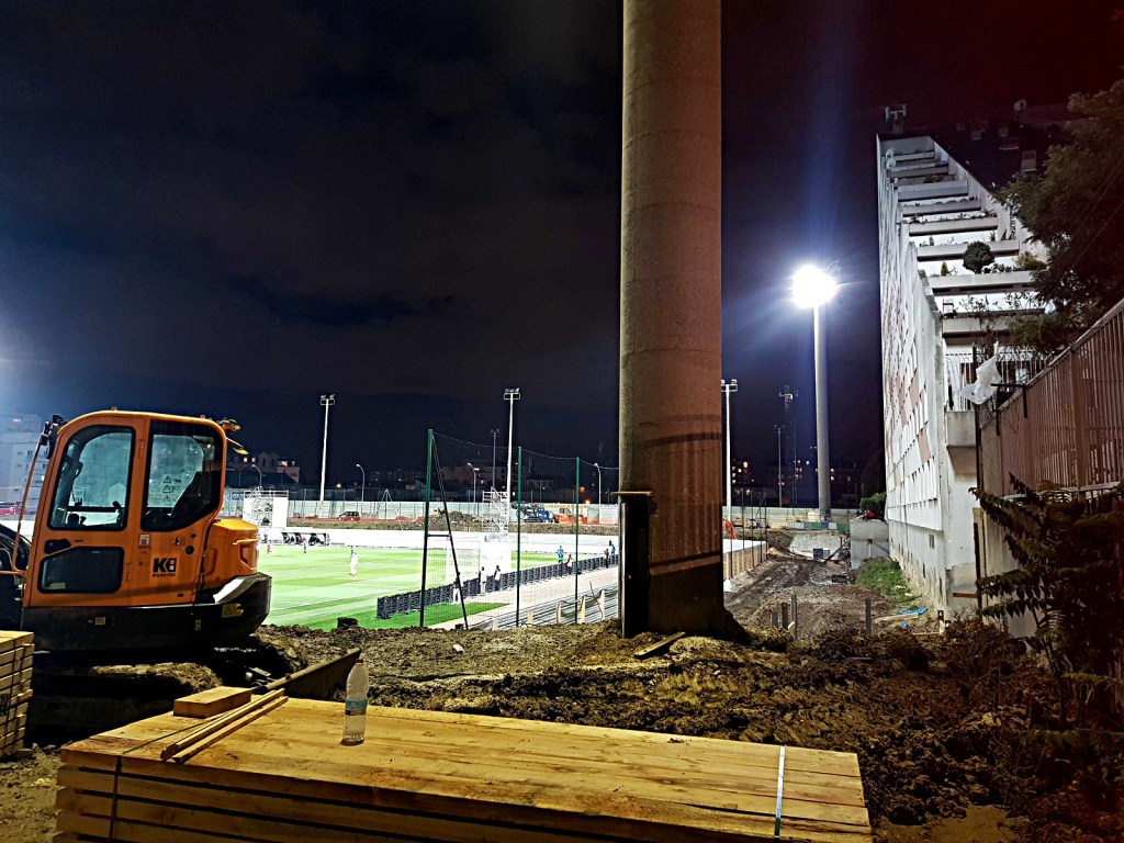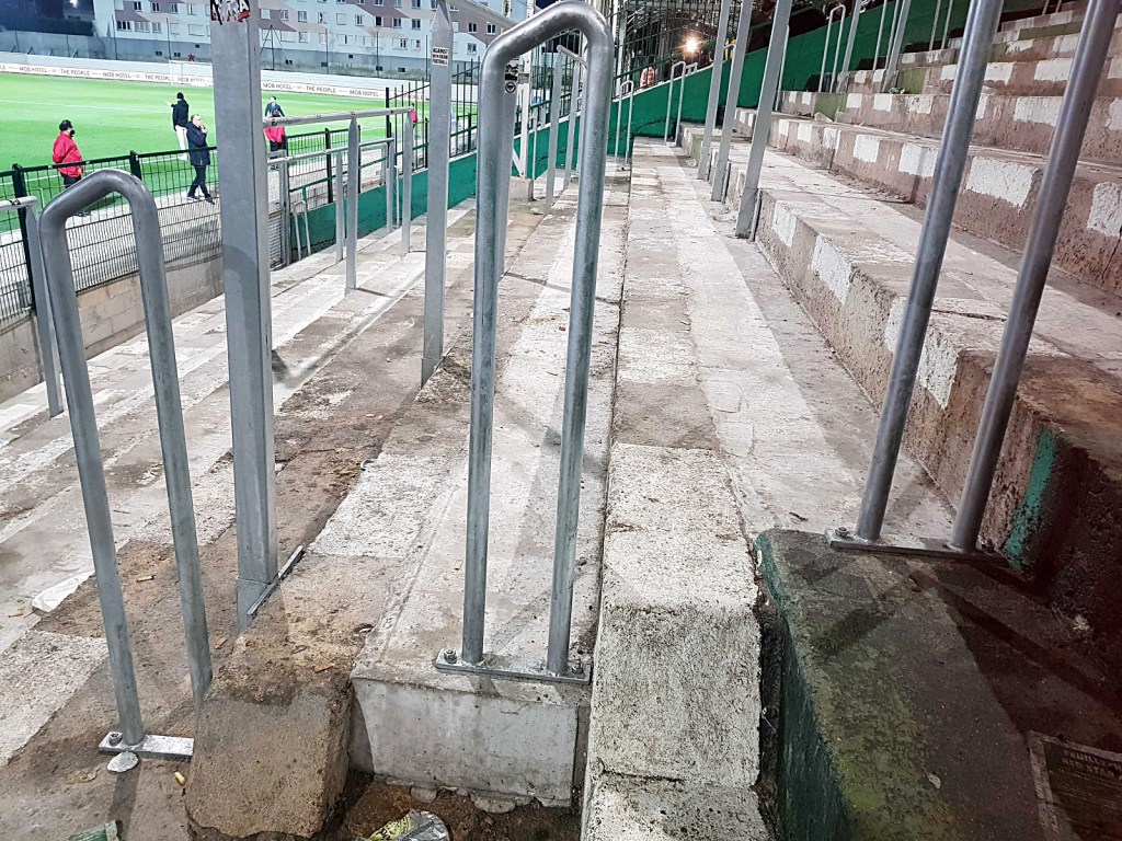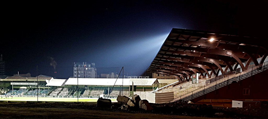 im hier und jetzt baut der club sein stadion um. in der praxis wurde die längsseiten tribüne, welche seit dem „großen sturm“ von 1999 kein dach mehr hat, vollständig abgerissen. auch die süd-östlich gelegene „naturtribüne“, die sich vor dem heimlichen markenzeichen, dem markanten wohnhaus befindet wurde komplett abgetragen. hier soll der neue gästeblock entstehen. dies könnte in zukunft spannend werden, wenn der ein oder die andere hausbewohner*in wieder mit raketen und anderen freudenfeuern um sich schießt. in beiden baustellen wurde das fundament gegossen und stützkonstruktionen zum benachbarten gebäuden und kunstrasenplätzen verbaut. das fußballfeld ist jetzt aus klassischem naturrasen. der alte kunstrasen liegt zusammengerollt in der ecke neben der tribüne „premiére ouest“. auf der „tribune rino della negra“, auf der die ultras stehen wurden erfreulicherweise die eigenwilligen aussparungen verschlossen, in welchem manch mensch beim heftigen pogo schon mal verschwand. außerdem wurden wellenbrecher installiert. das ändert aber nix an der guten stimmung, welche mitunter eine ohrenbetäubende lautstärke erreicht. wer den alten charm dieses zauberhaften stadions nochmal live erleben möchte sei empfohlen: ranhalten! wenn die saison vorbei ist, wird es auch mit dem alten spirit vorbei sein.
