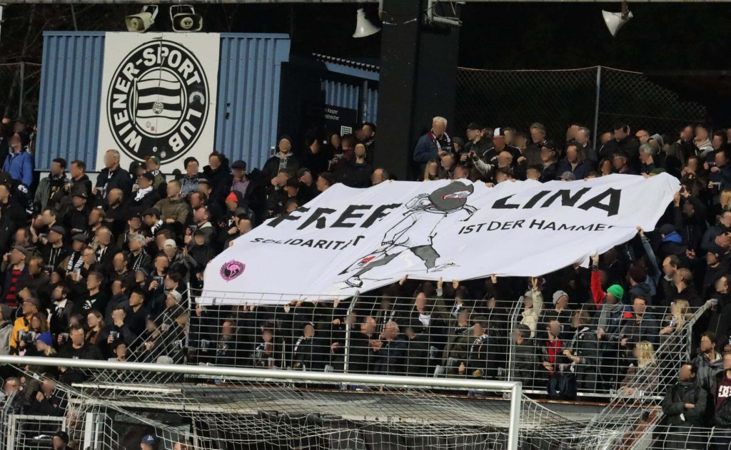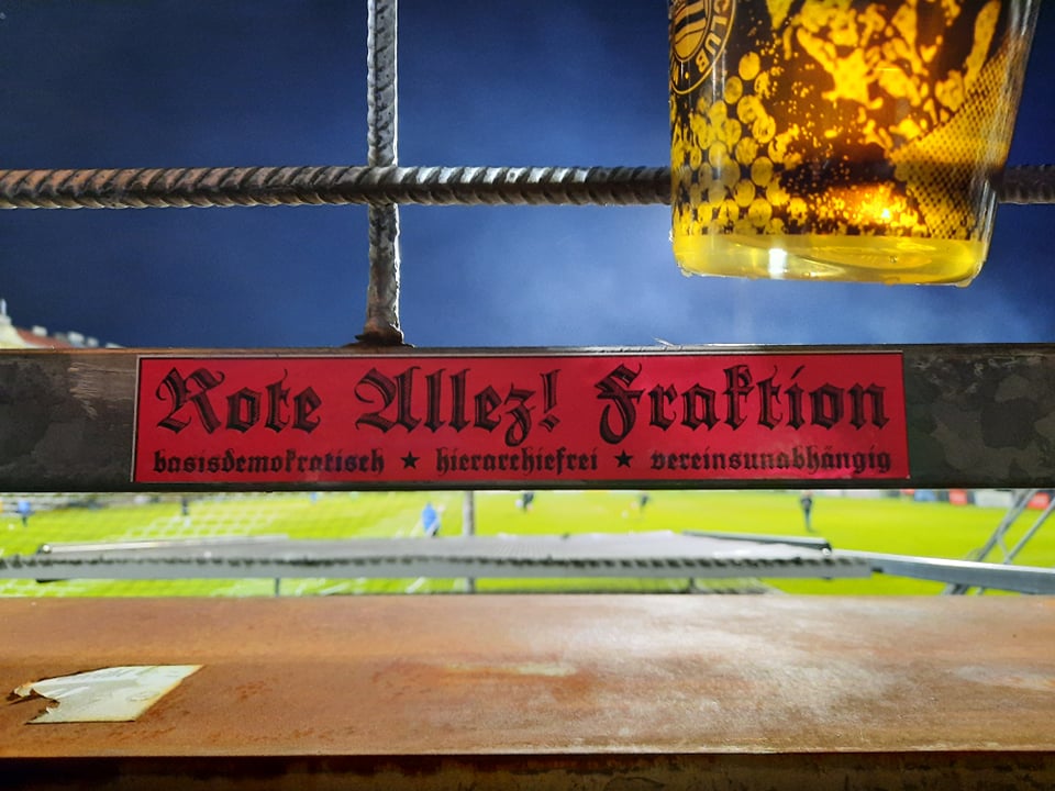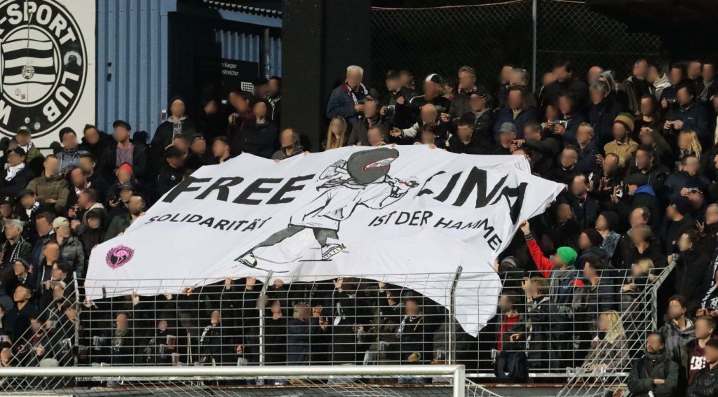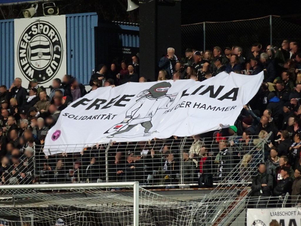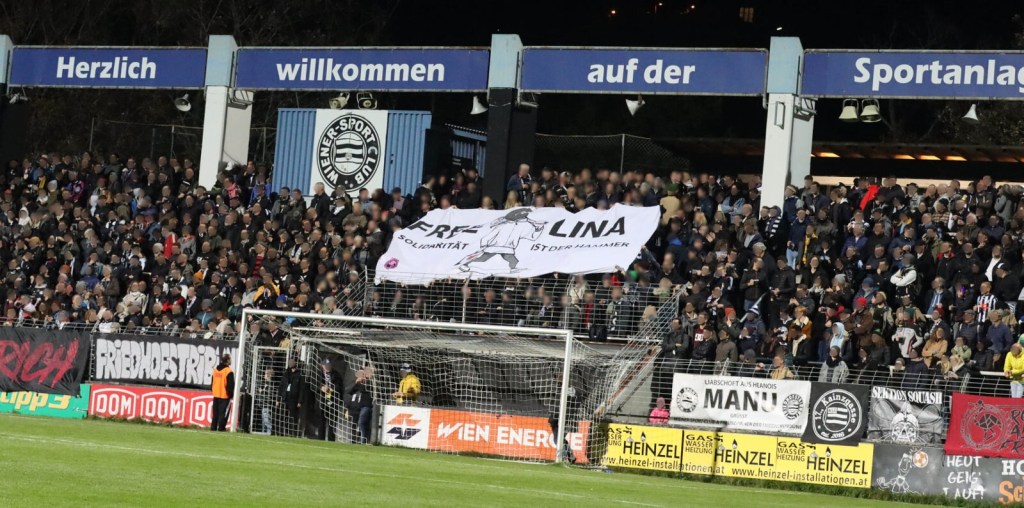 Doch auch auf schwarz-weißer Seite gab es etwas Ungewohntes zu bestaunen, denn wenn sie auch normalerweise mehr auf englischen Support setzen, so haben unsere Freund*innen für unsere Kampagne eine Ausnahme gemacht, sodass wir unsere stolzen 18qm an Solidarität für Lina bei ihnen entfalten durften. Einen riesigen Dank an dieser Stelle an euch und an all die lieben Menschen, die während und auch nach des Spiels unsere Choreo gefeiert haben. Ihr seid spitze!