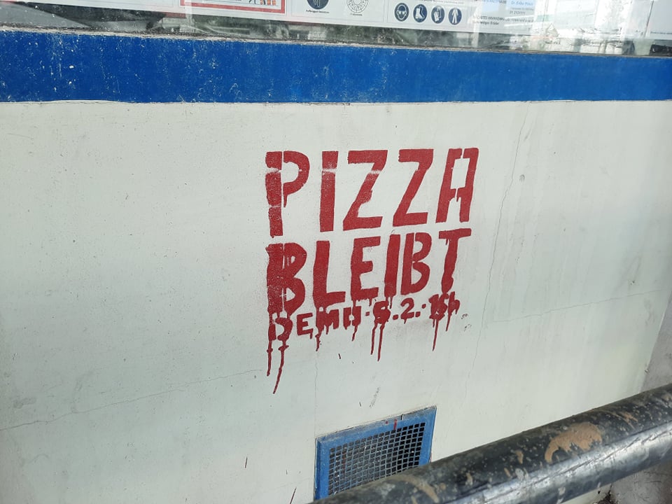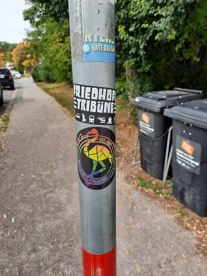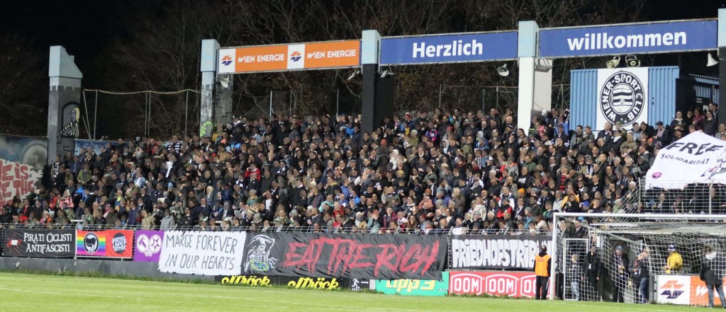 Dass es sich bei dem „Derby of Love“ vor allem um eine Marketingstrategie handelte, wurde uns schon vor dem Spiel bewusst, denn auch wenn man oft hörte „Einige meiner besten Freund*innen stehen auf der anderen Tribüne“ so waren doch ein paar Spannungen zu spüren. Diese waren natürlich nicht mit „normalen“ Derbys vergleichbar, aber ein bisschen Derbystimmung kam dadurch dann doch noch auf. So folgte auf ein „Eat the rich“ Banner des WSC eine offensichtlich spontan gesprühte „Feed the rich“ Tapete von First Vienna, die zugegebenermaßen anfangs für etwas Verwirrung und teilweise auch Ablehnung auf der Friedhofstribüne sorgte. Nach Abpfiff brauchten wir ein paar Minuten um das Ergebnis zu verdauen, doch früher oder später konnte man rund um den Sport-Club Platz wieder Blau-Gelbe in den Armen von Schwarz-Weißen liegen sehen und umgekehrt. Wir ließen den Abend bei dem ein oder anderen alkoholischen Getränk und den nur zu empfehlenden Käsekrainern ausklingen, ehe wir uns gemeinsam auf den Heimweg machten.
