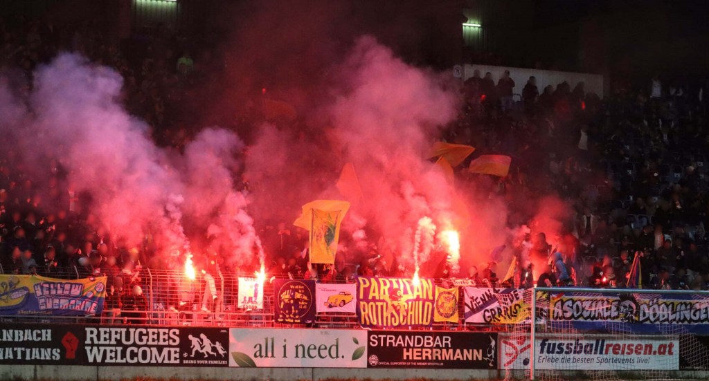 Wenn auch das Ergebnis des Spiels recht eindeutig erscheint, so war es insbesondere in der zweiten Hälfte ein ziemlicher Nervenkitzel, den mensch auf der Friedhofstribüne miterlebte. Latte, Innenpfosten… irgendwann muss das Ding doch mal reingehen, dachten wir uns. Doch leider wollte das Runde einfach nicht ins Eckige (zumindest nicht in das von First Vienna). Trotz des Ergebnisses war die Stimmung auf beiden Tribünen sichtlich gut und auch für die Pyro-Liebhaber*innen gab es einiges zu bestaunen, denn die Blau-Gelben hatten offensichtlich keine Mühen gescheut, ordentlich Zündstoff mitreinzubekommen und so ergab sich der ein oder andere ansehnliche Anblick für unsere Pyroman*innen-Augen.