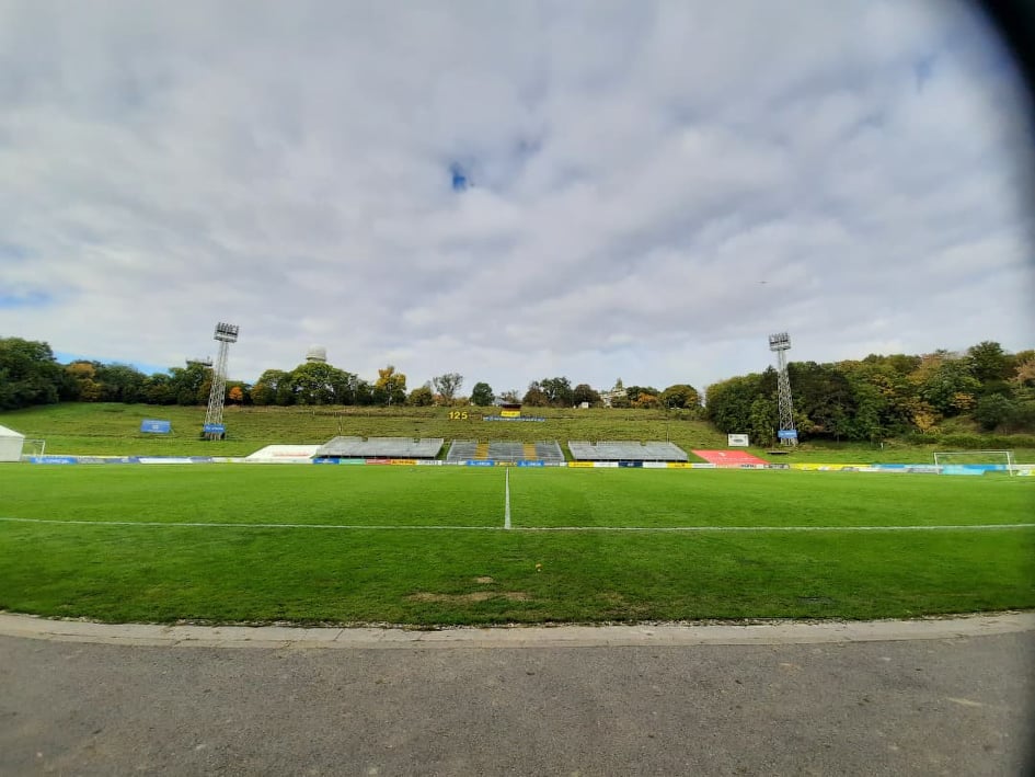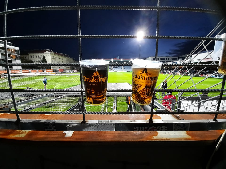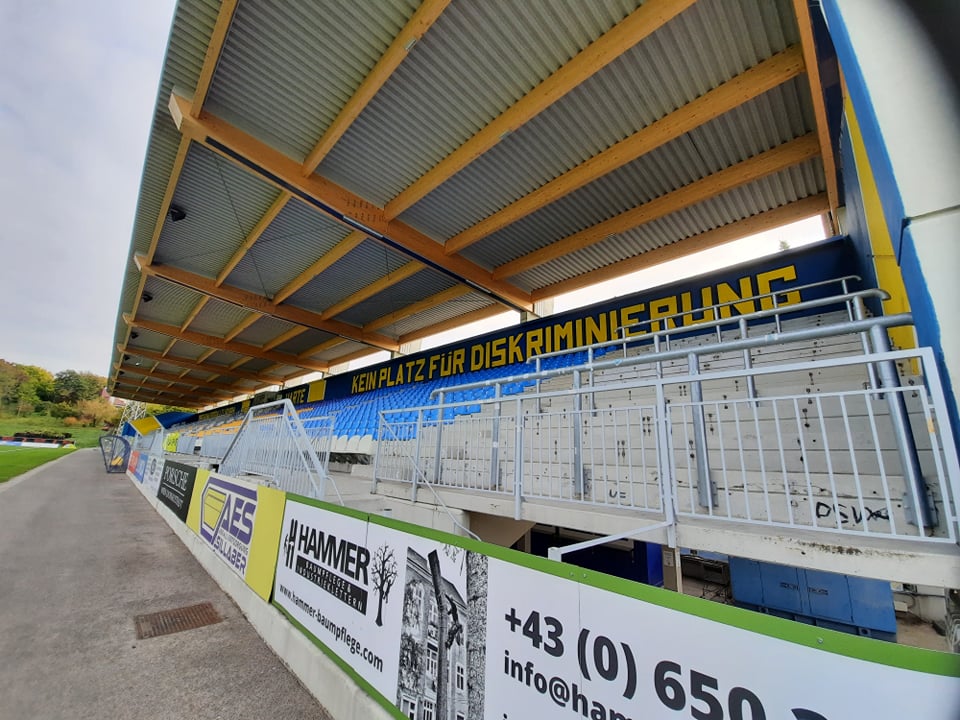 Danach ging es dann schon nach Hernals, wo manch einer alte Bekannte, andere dafür neue Gesichter sowohl der Blau-Gelben als auch der Schwarz-Weißen trafen. Sowohl vor, als auch während und nach dem Spiel wurden wir dabei aufmerksam auf Schritt und Tritt von unseren Freund*innen der Friedhofstribüne betreut und so lernten wir auch die Gepflogenheiten auf ebenjener (echt steilen) Tribüne kennen. Die Lage des Stadions konnte dabei nicht cooler sein. Mitten im Wohngebiet liegt der Wiener Sport-Club Platz nämlich und daher konnte mensch auch den Nachbar*innen auf ihren Balkonen förmlich die Hand reichen, die ihren Sport-Club unterstützten. Über 6.500 Zuschauer*innen waren mit uns vor Ort und so wurde es (nach den Coronazeiten ungewohnt) kuschelig auf den Stufen, sodass ein Klobesuch eine kleine Herausforderung darstellte. Dafür konnten wir direkt aus erster Reihe hinterm Tor zuschauen und den Spielern beider Teams (natürlich nur in der Theorie) auf den Kopf spucken, wenn sie aus dem Spieler*innentunnel kamen.