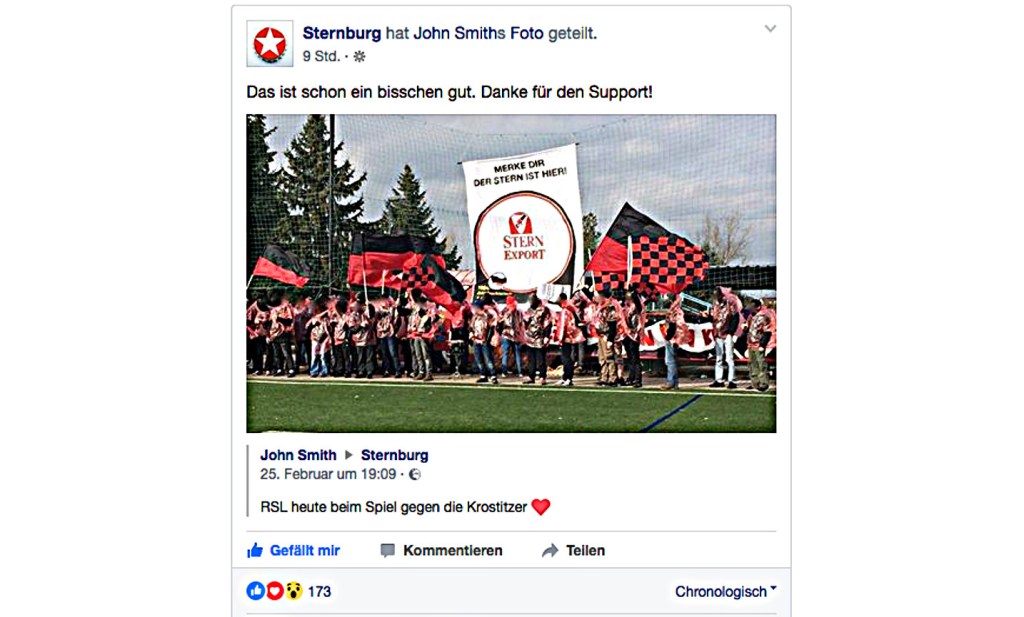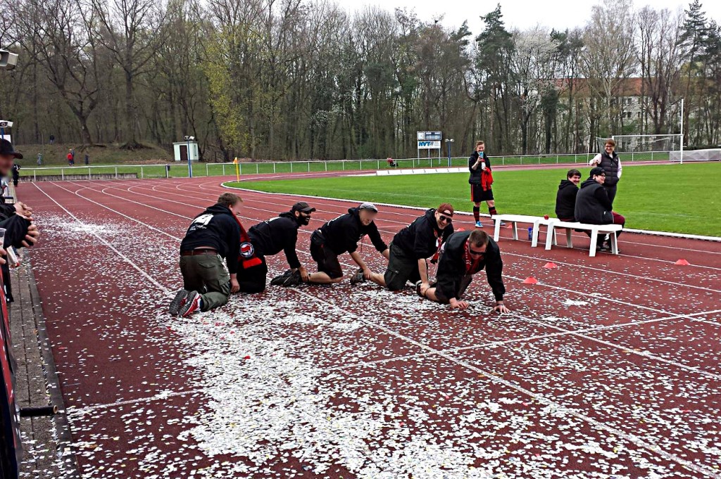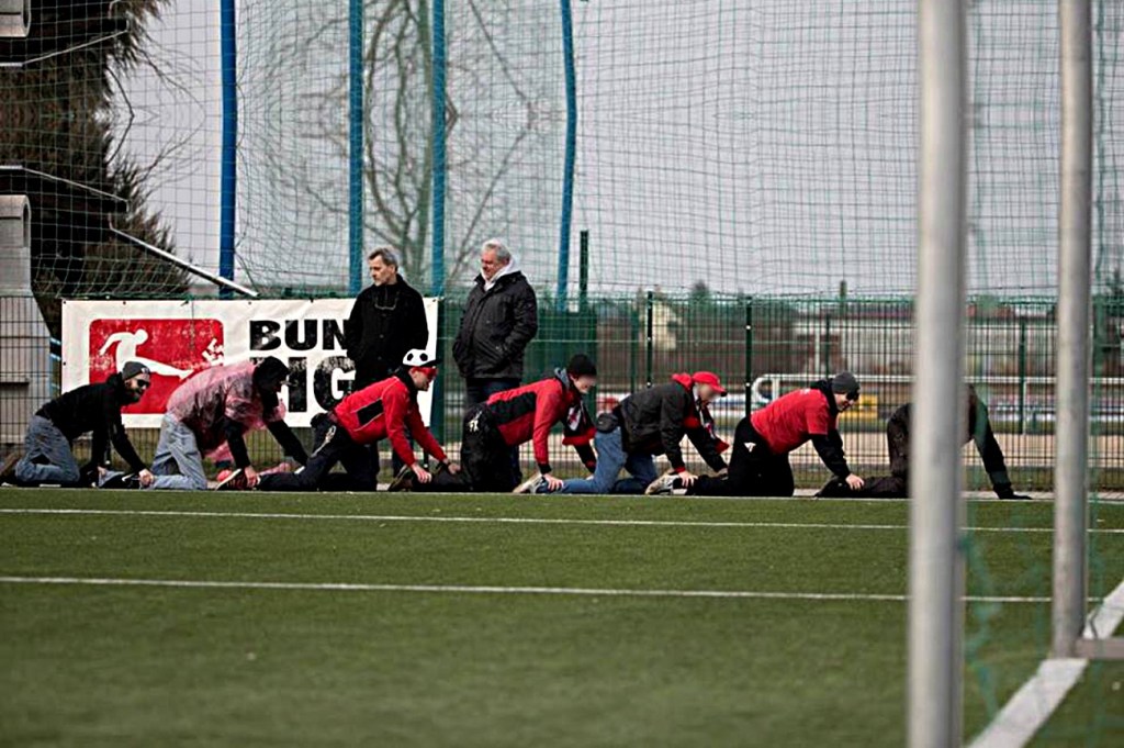 der erste gruppenauftritt fand am 25.02.2017 beim fsv krostitz, aber auf dem delitzscher kunstrasen statt. dafür wurde eine auswärts blocki angefertigt, welche aufgrund der platzverlegung dann nicht über den block, sondern hinter dem block hochgezogen wurde. der garstige wind, die wackelige ballfanganlage und mosernde heimordner*innen versuchten sich dabei als spielverderber*innen, und scheiterten 😉 bemerkenswert auch die reaktion von sternburg. im laufe des spiels versuchte sich „commando raupe“ gleich noch am ersten spielabbruch, aber es reichte nur zu einer spielunterbrechnung. der „raupenkopf“ hatte die eckfahne beim passieren mitgehen lassen. zwei monate später tauchte das wilde biest bei einem game der ladies in borna auf, verspeiste ein paar faschos, suhlte sich im konfetti und verschwand bevor jemand ab-, unter- und sonstwas brechen konnte…