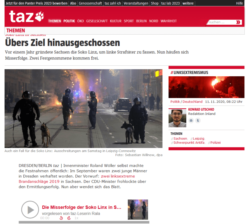 Ein Vice-Artikel (Quelle: https://www.vice.com/de/article/884d8x/leipzig-vor-ob-wahl-connewitz-linksextremismus-gewalt-eskaliert-dann-debatte) aus 2020 zeigt die Zusammenhänge aus Politik, im Modus der mit der sächsischen AfD konkurrierenden Regierungspartei CDU, im Stimmungsfeld von 2019 sehr sachlich auf. Auch wie etwa der Oberbürgermeister Jung (SPD) im Wahlkampf um sein Amt hier die vermeintlich noch(!) konservativen Phantasien bediente und Parolen, jenseits der Realität, bespielen musste/wollte.