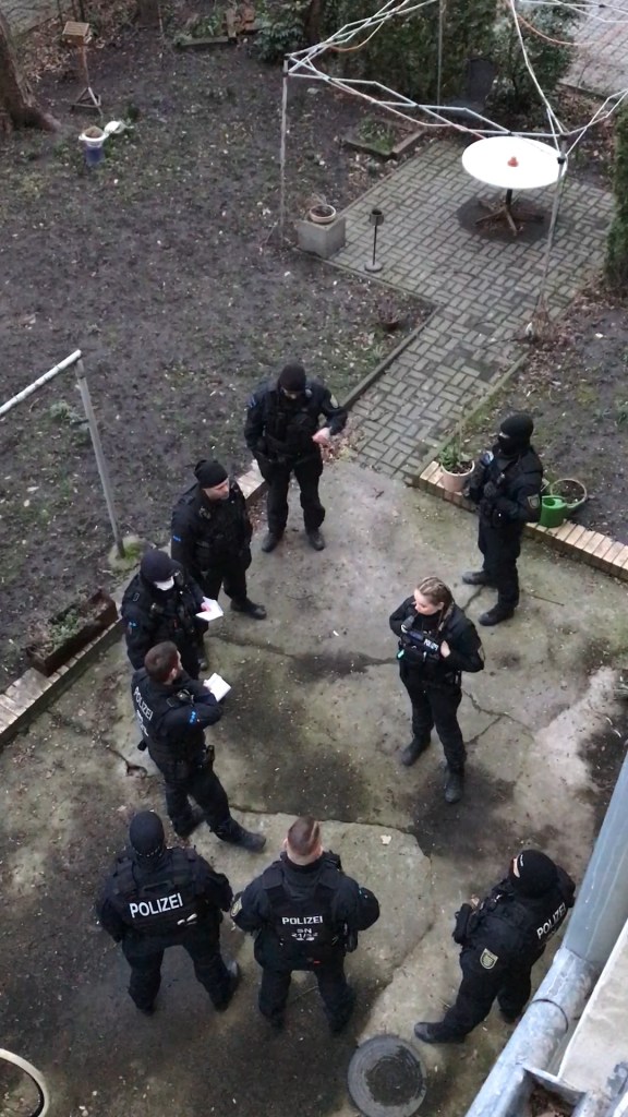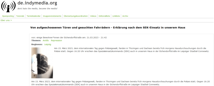 „Am 15. März 2023, dem internationalen Tag gegen Polizeigewalt, fanden in Thüringen und Sachsen bereits früh morgens Hausdurchsuchungen durch die Polizei statt. Gegen 16:20 Uhr erschien das Spezialeinsatzkommando (SEK) auch in unserem Haus in der Eichendorffstraße im Leipziger Stadteil Connewitz.