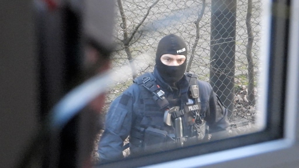 Vermummte Polizei schleicht sich um 16:20 Uhr in den Hof, es sind laute Knallgeräusche aus dem Treppenhaus zu hören. Kurz darauf stürmt das SEK eine bewohnte Wohnung, in der sich zu diesem Zeitpunkt aber niemand aufhält.